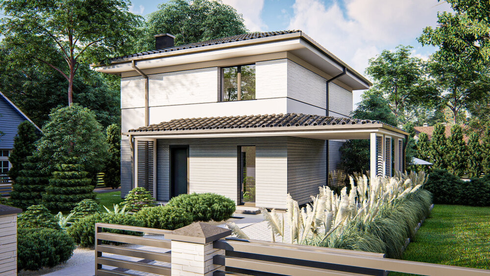 Двухэтажный проект дома с современным обликом и 4-х скатной крышей