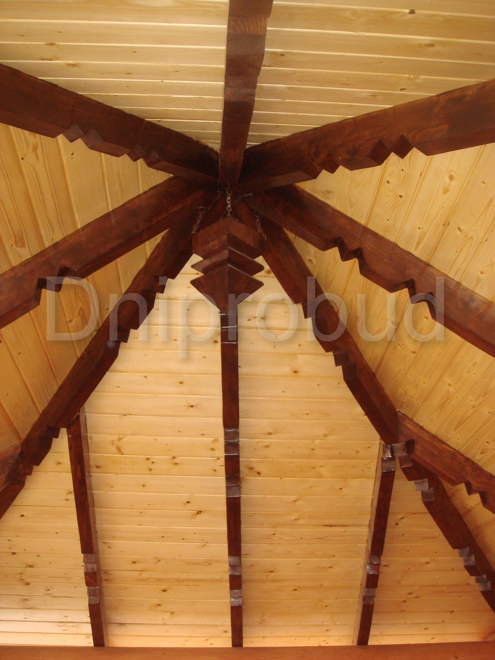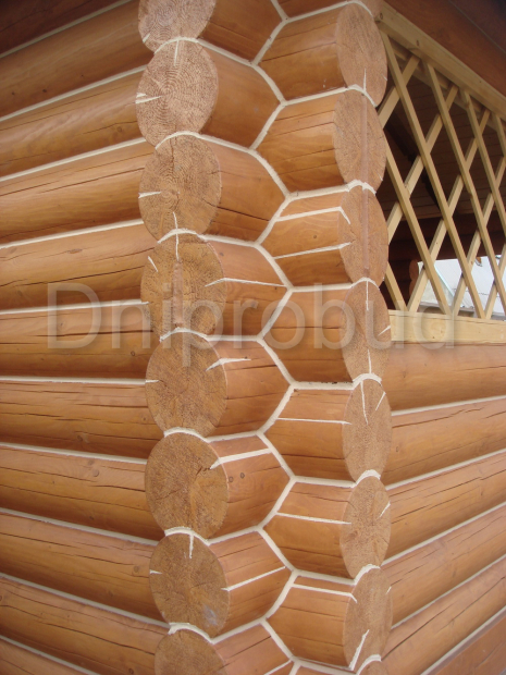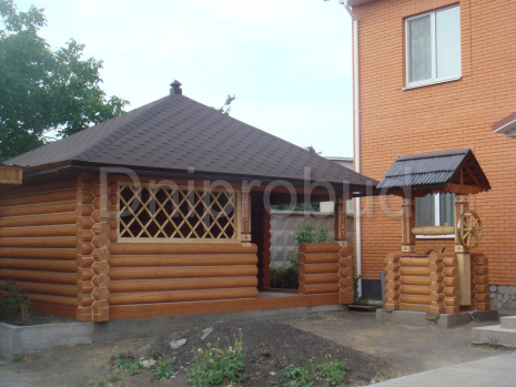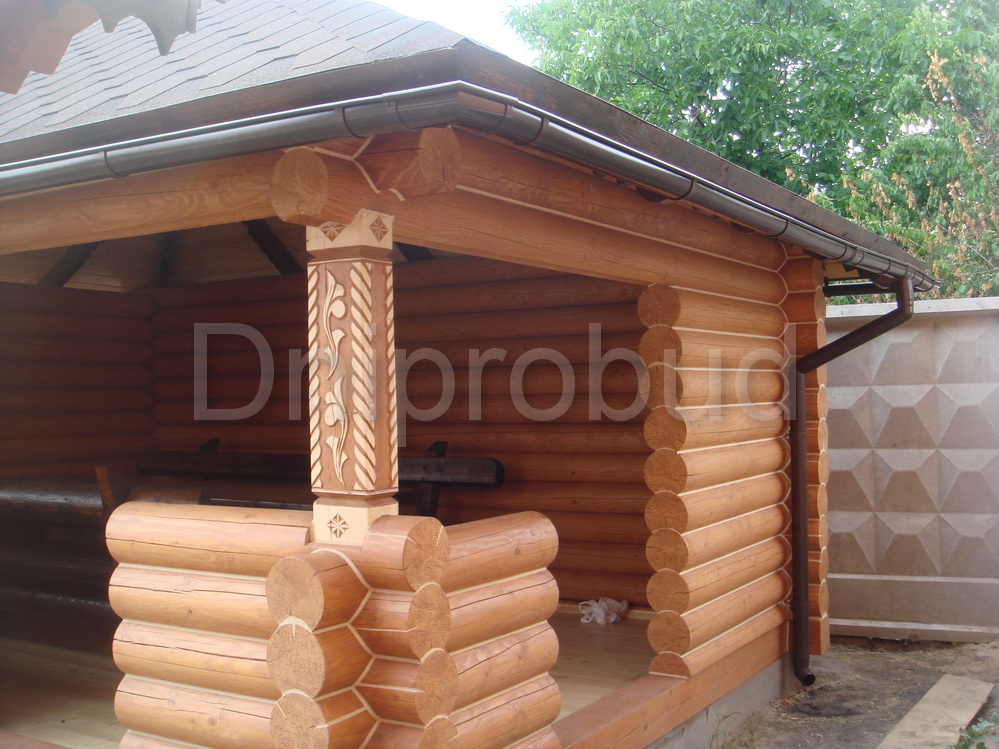 Будівництво альтанки в Києві 6*4 м. Оциліндрована колода, герметизація, фарбування. Внутрішня обробка. Меблі і декор. Декорування колодязя. Різьба по дереву.