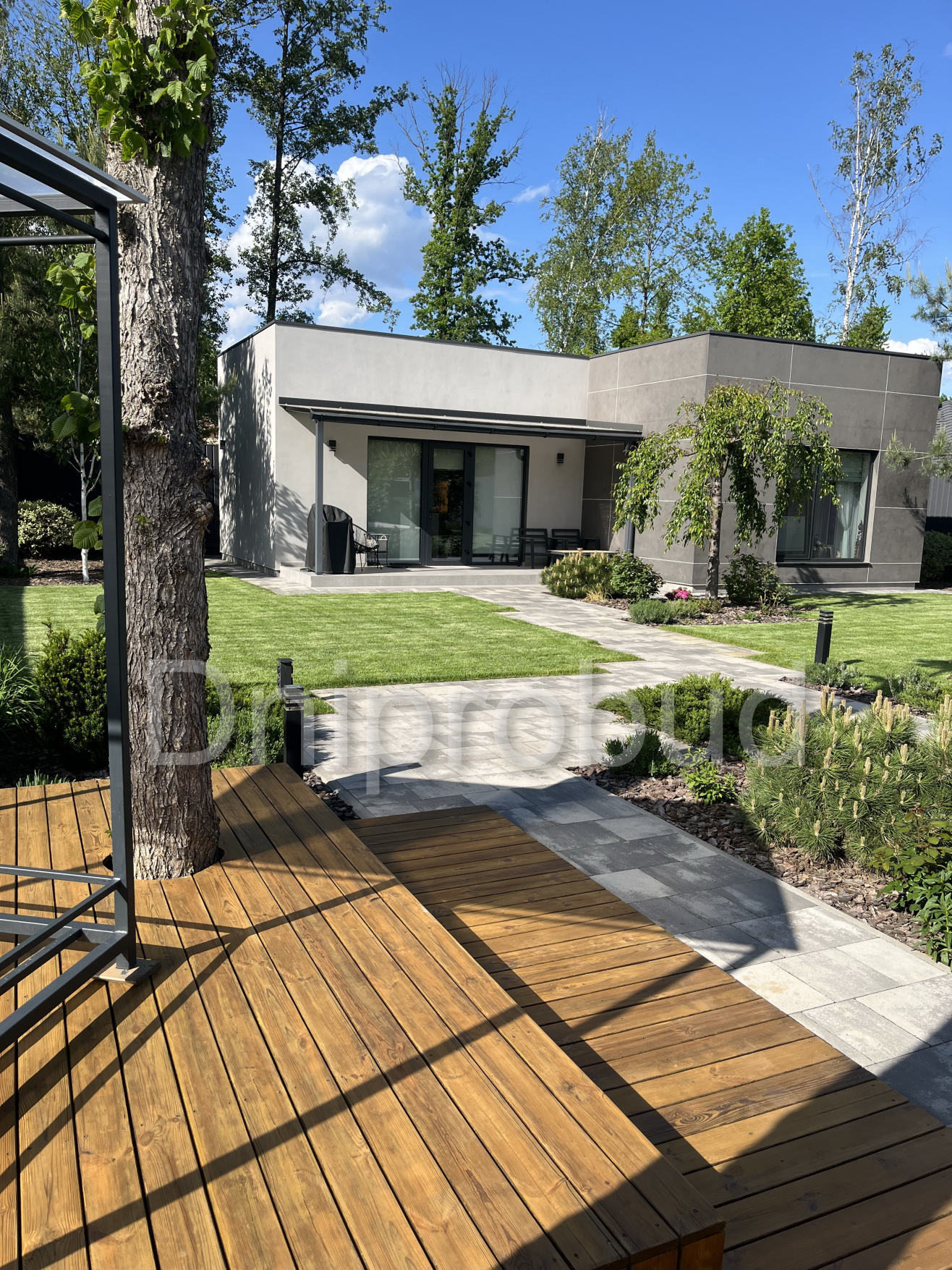 На ділянці максимально збережені насадження та організований полив під настилами зони відпочинку.