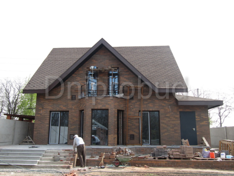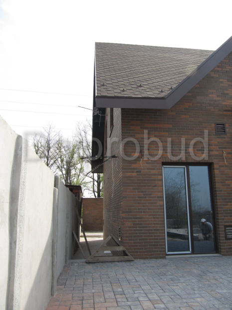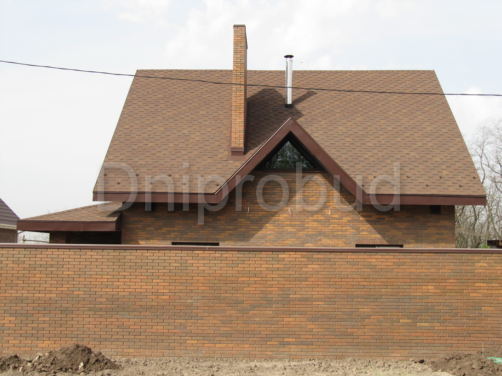 Будинок площею 154 кв. мансардного типу. Мінімальна висота стін на 2-му поверсі 2м, дозволяє використання простору поверху також, як і в 2-х поверховому будинку. Цегла загальнобудівельний+ мін вата 100 мм + клінкерна цегла з кольоровою затіркою. «Гнута» бетонні сходи, утеплення покрівлі пінополіуретаном. Вбудовані автоматичні ролети. Пергола (див. розділ «Малі архітектурні форми»), басейн. З другого поверху відкривається вид на р. Дніпро.