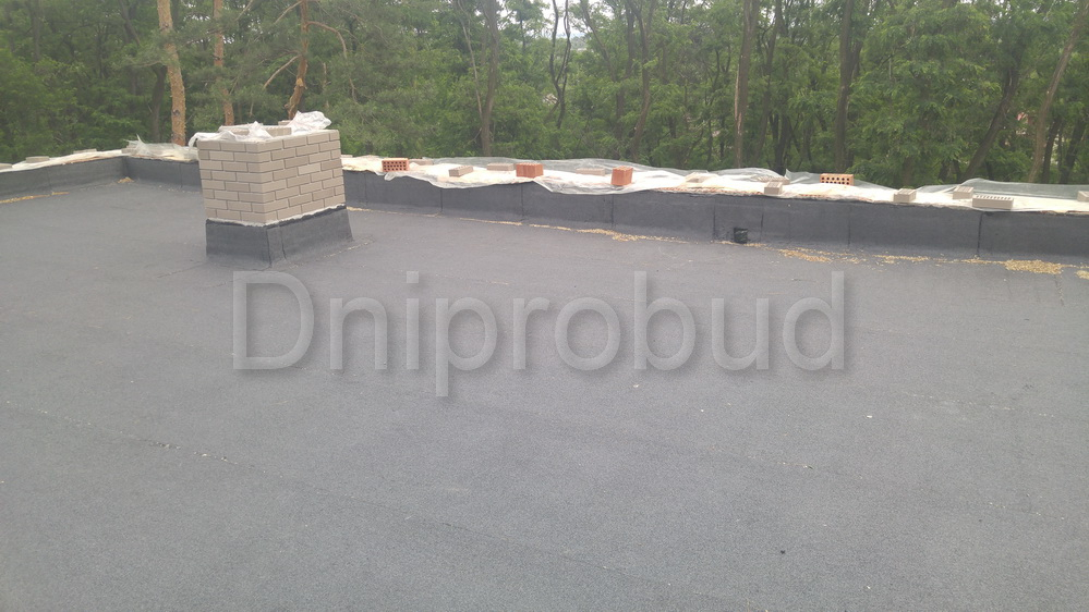 Покрівля: плоска, утеплена екструдованим пінополістиролом. Гідроізоляція виконана в два шари руберойдом Техноеласт ЕКП-5.5.