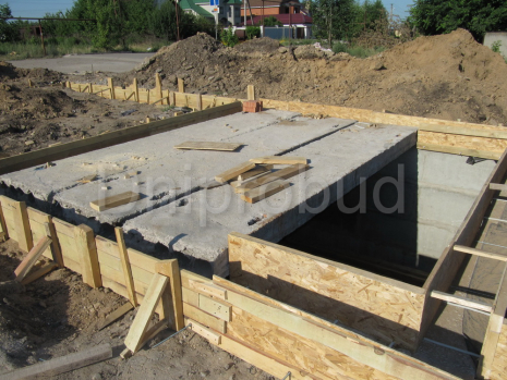 Для економії матеріалу задля збереження міцності фундамент виконаний в трьох ярусах, починаючи з підвалу з поступовим виходом на фундамент будинку. Монолітна плита підлоги проармована разом з бетонним поясом зверху фундаментних блоків.