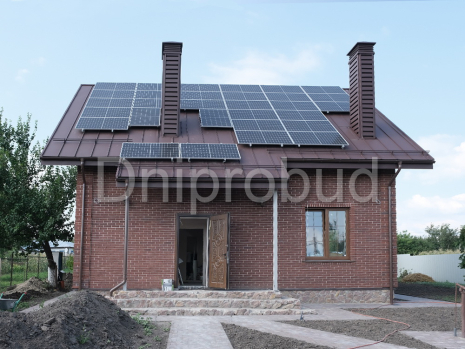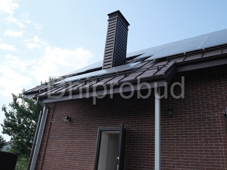 - Покрівля: фальцева, на покрівлі встановлено сонячні батареї. Площа сонячних батарей дозволила мінімізувати, а в деякі місяці отримувати прибуток від виробництва електроенергії цими батереями