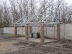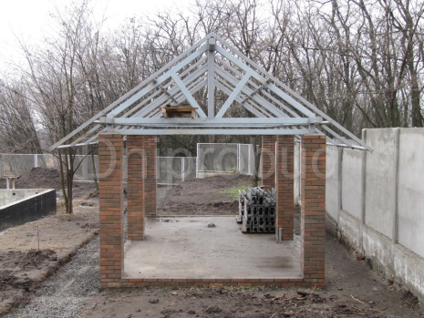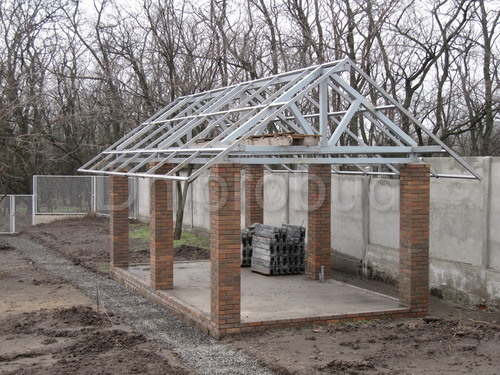 Каркас виконаний з квадратної труби 100*100 мм. Стовпи обкладені клінкерною цеглою. Фундамент (чорнова підлога) — ж/б плита.