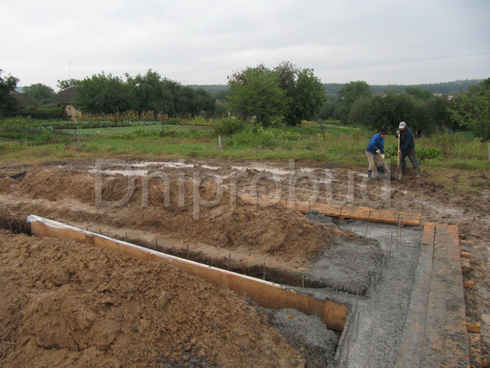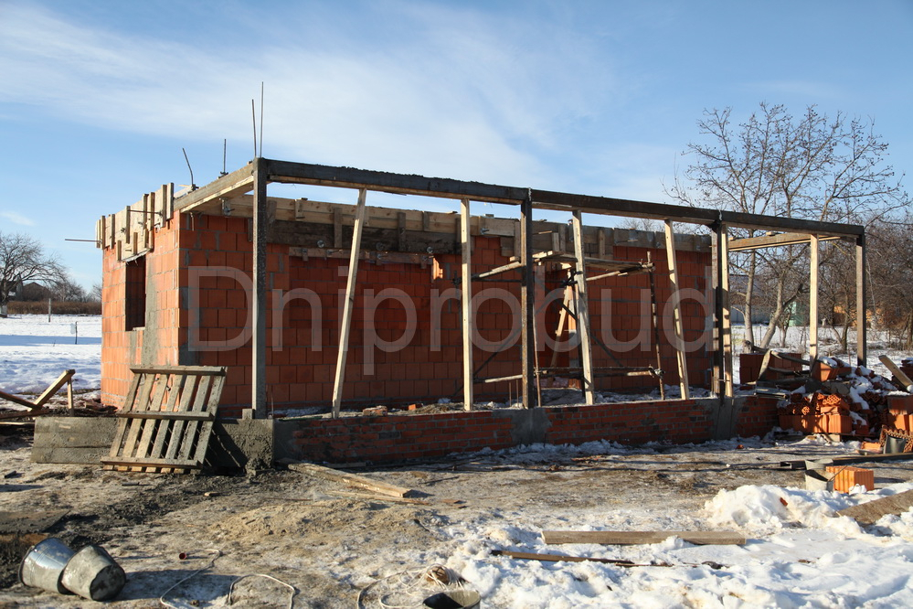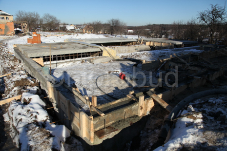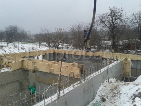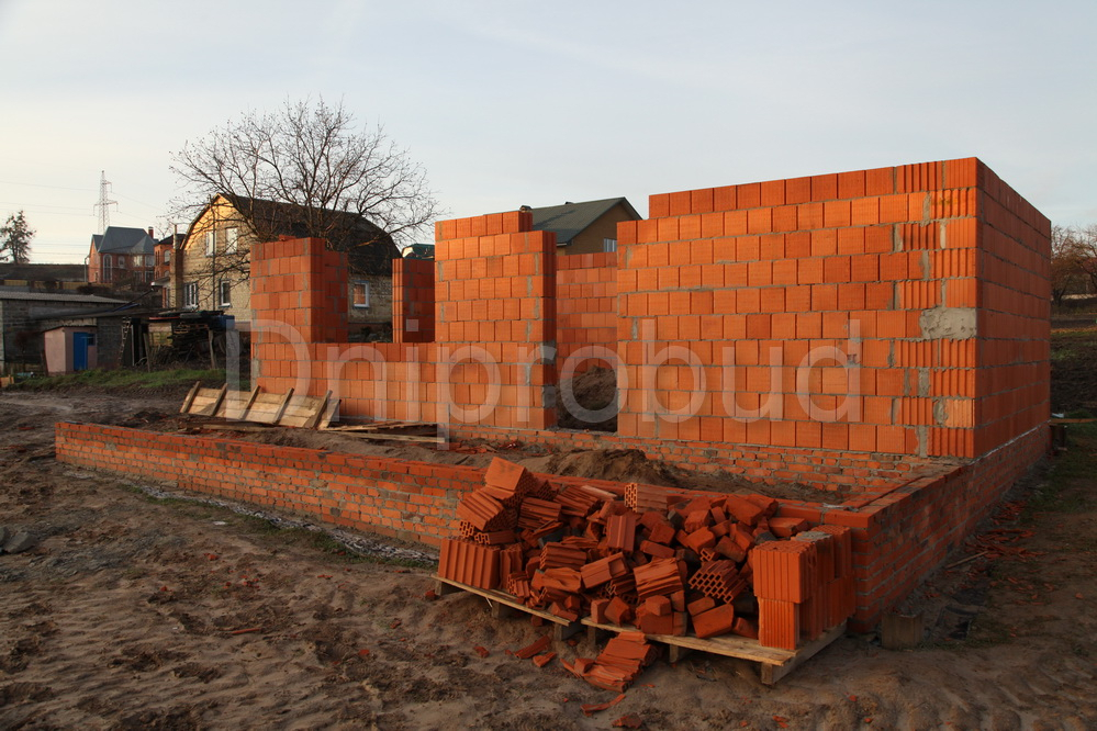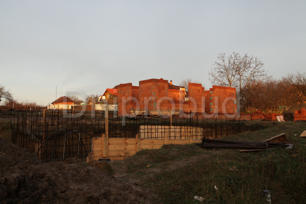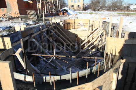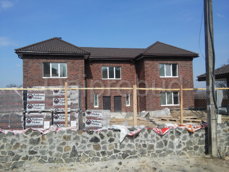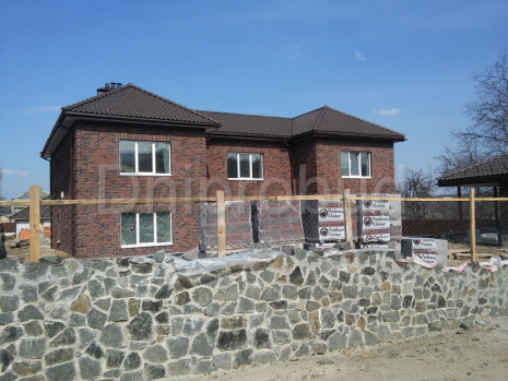 Будівництво садиби в Києві (с. Хотів). Садиба складається з: Будинок 2-х поверховий з цоколем під 1/2 будинку 19*14 м., площею 430 м. кв. Лазня з кімнатою відпочинку і відкритою терасою, 10,4* 7,3 м. Басейн монолітний 8*4 м, Погріб у вигляді окремої будівлі «Льох» 2,7*3,4 м. Гараж на 2 авто + навіс на 1 авто+ вольєр 7,2*10,4 м. Фундамент — монолітна плита товщиною 30 см, блоки ФБС 24*6*6 і 24*5*6, армопояс. Стіни — глиняна цегла загальнобудівельний 380 мм + мін. вата 100 мм. + клінкерна цегла 120 мм. Покрівля — натуральна черепиця.
