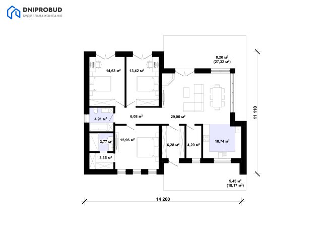 Db 33 – проєкт одноповерхового будинку, який передбачає комфортне та раціональне розміщення всіх основних приміщень для сімейного проживання.