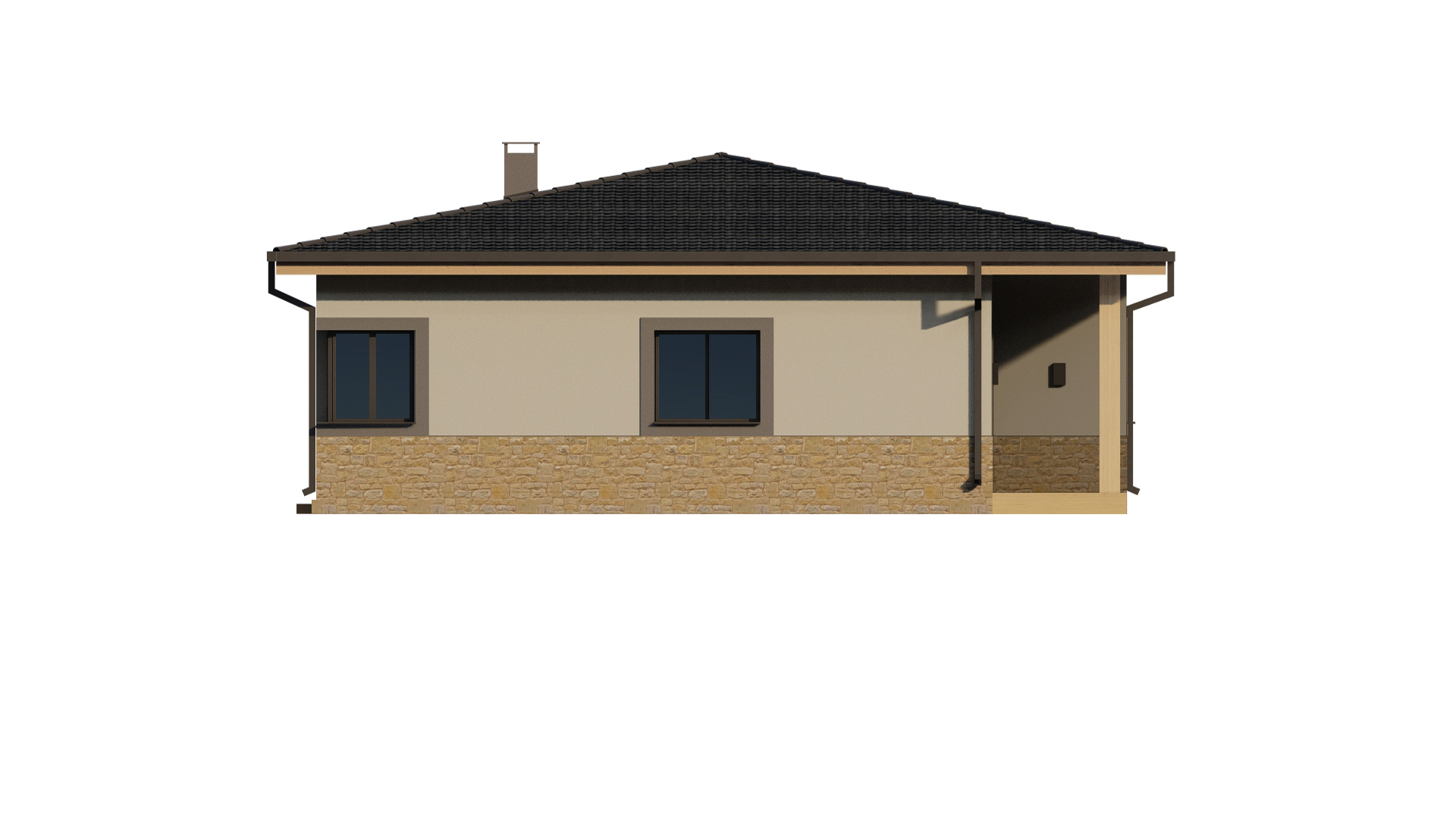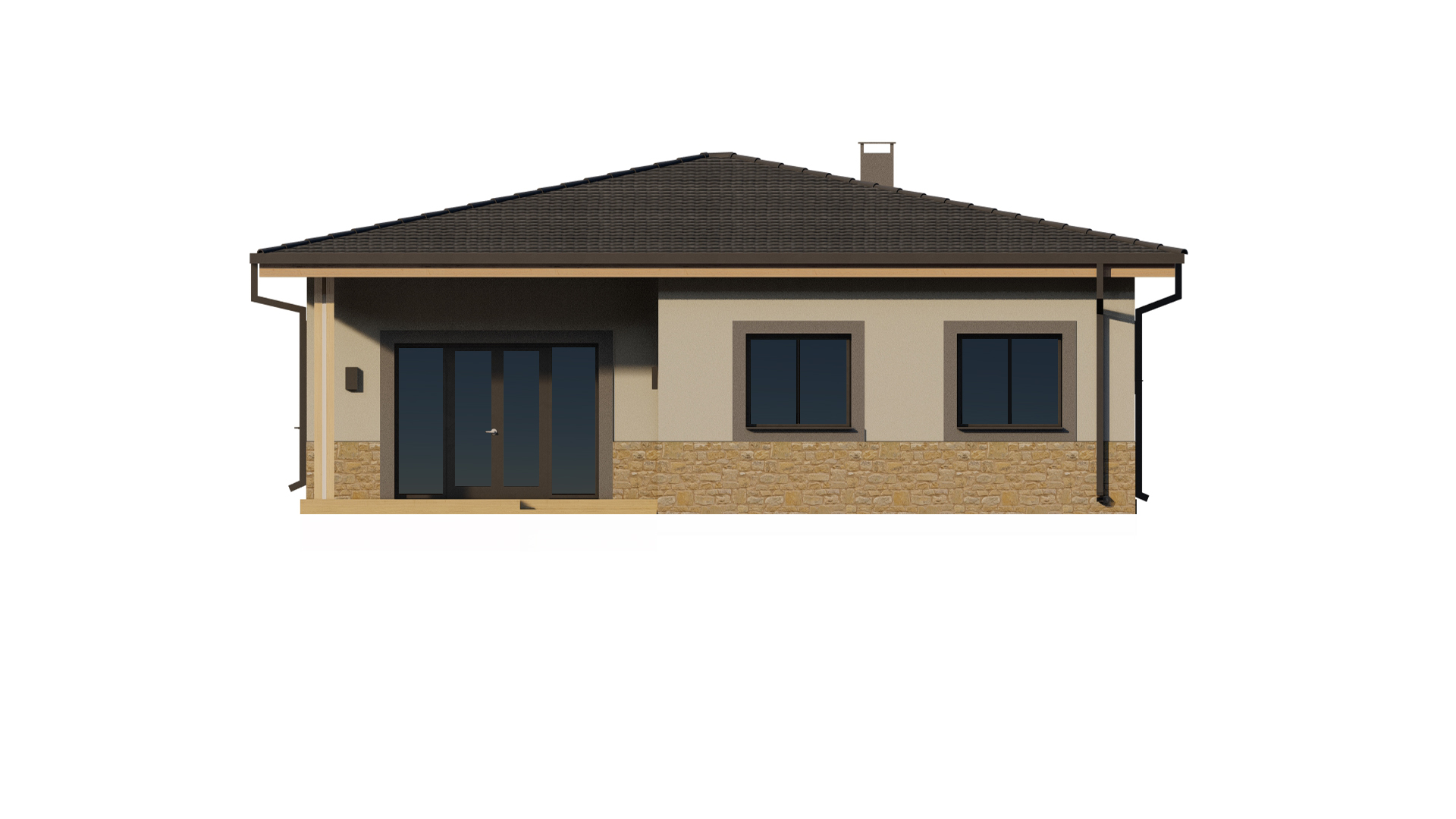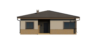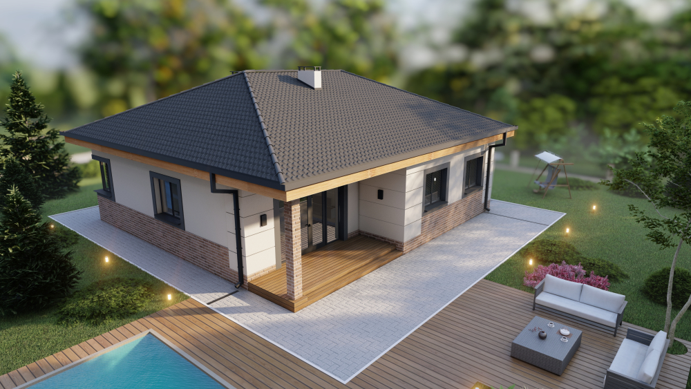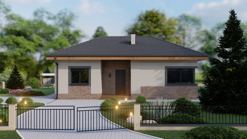 Db 38 — зручний і доступний одноповерховий будинок для родини з 4–5 осіб. Компактна форма, стильний багатосхилий дах та оригінальні акценти на фасаді надають проєкту сучасного вигляду.