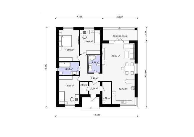 Функціональне планування включає простору вітальню з виходом на терасу, кухню з коморою, чотири спальні та велике господарське приміщення. Продумана організація простору у Db 38 створює затишок і комфорт для щоденного життя.