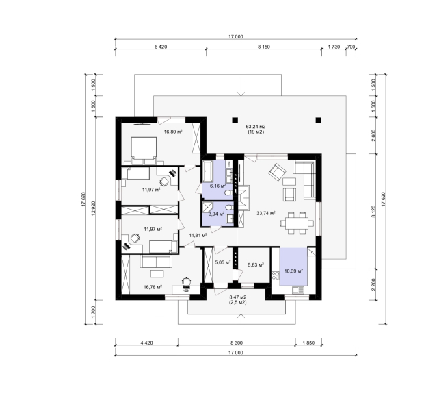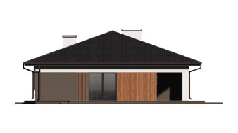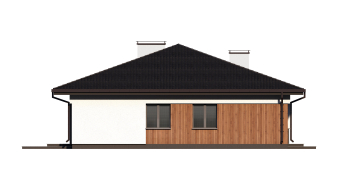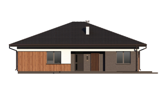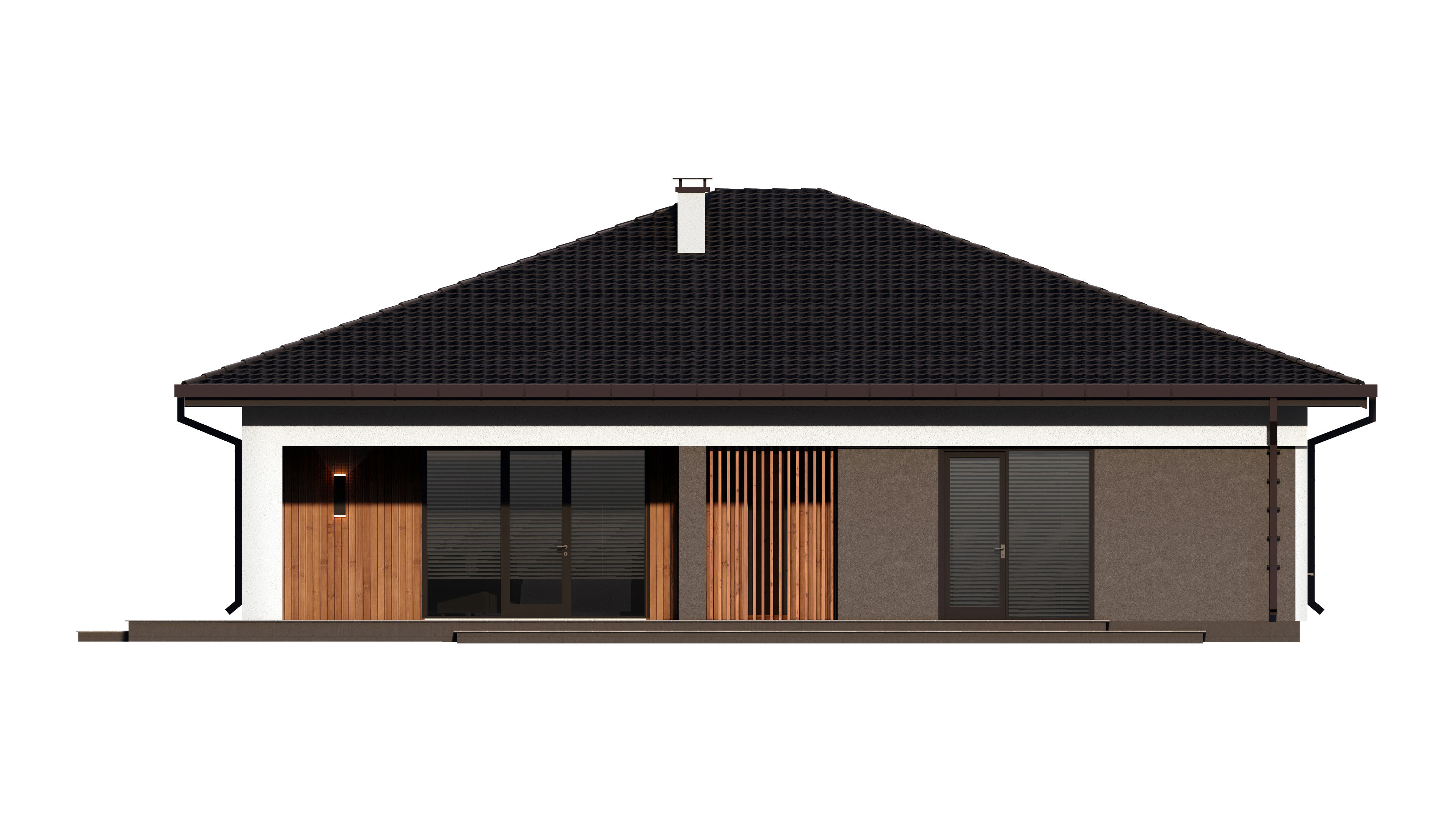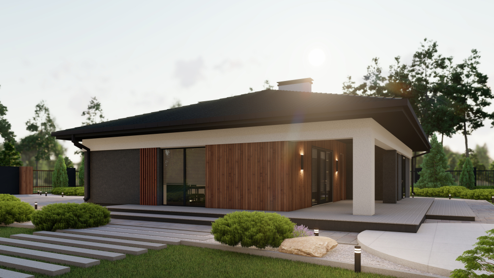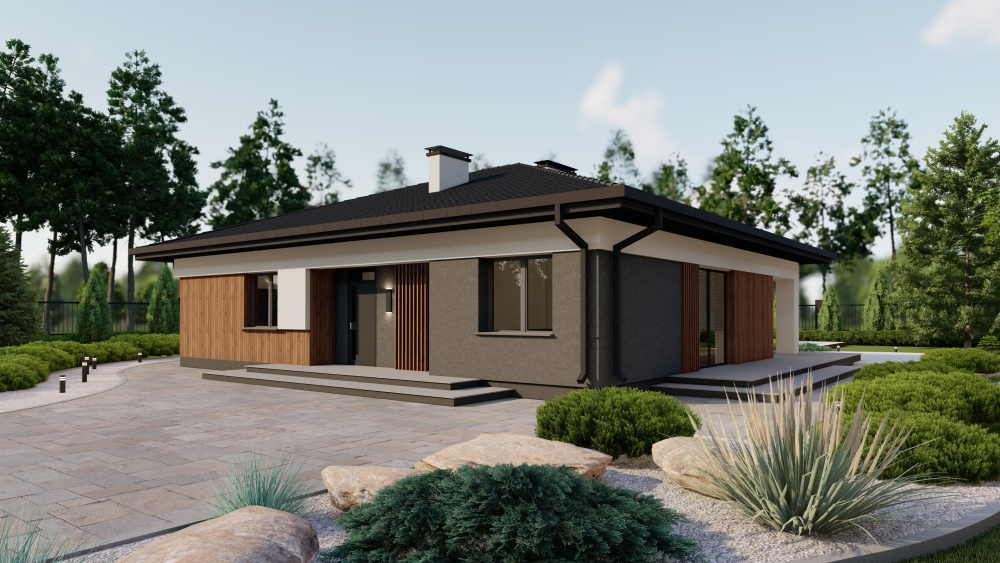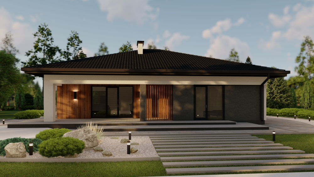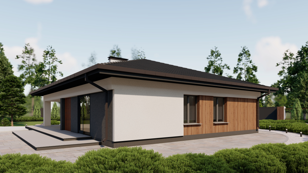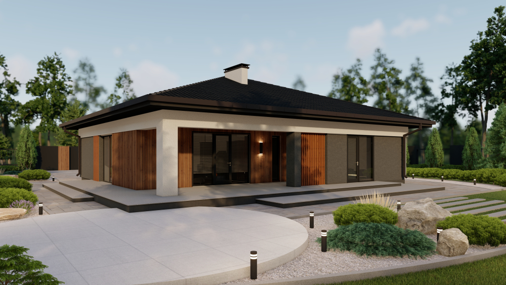 Db 43 — це стильний одноповерховий будинок із чотирьохскатним дахом і продуманою квадратною формою у плані. Лаконічний зовнішній вигляд із акцентом та великі вікна надають будівлі відчуття затишку.