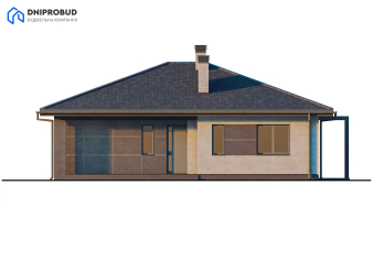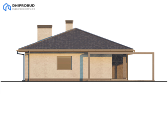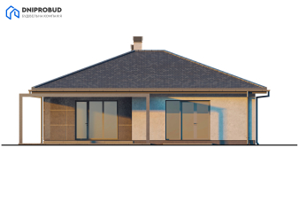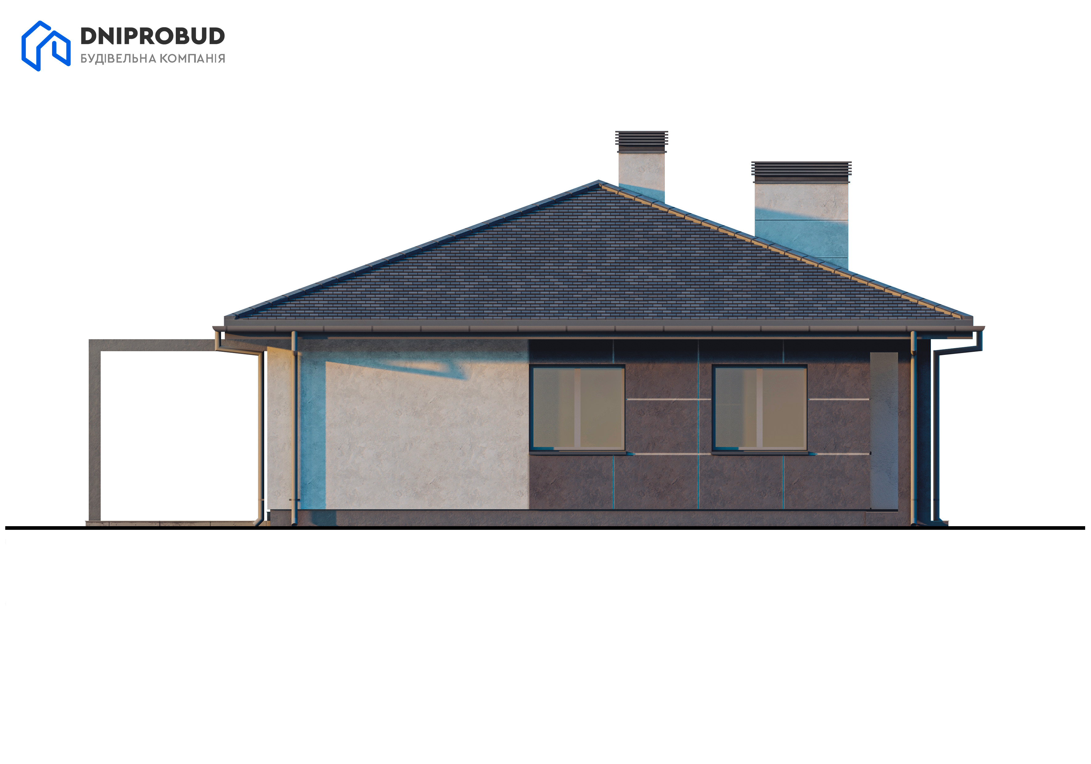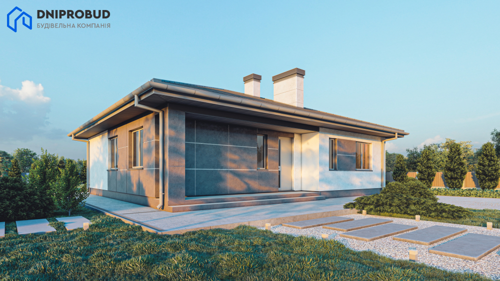 Проєкт є втіленням сучасного бачення комфортного заміського життя, реалізованого в елегантному одноповерховому будинку. Його архітектура вирізняється чіткими геометричними формами та мінімалістичним підходом, де головна увага приділена функціональності та естетиці. В оздобленні фасаду гармонійно поєднуються два контрастні матеріали: світла декоративна штукатурка та великі панелі насиченого графітового кольору, що надає будівлі виразного та динамічного вигляду. Завершує цілісний образ чотирисхилий дах темного відтінку з широкими звисами, доповнений двома масивними світлими димарями. Особливу роль у проєкті відіграє природне освітлення. Завдяки великим панорамним вікнам та розсувним скляним дверям внутрішній простір будинку наповнюється сонячним світлом, а межа між інтер'єром та навколишнім ландшафтом стає майже непомітною. Справжньою перлиною проєкту є простора задня тераса, частково накрита стильною перголою. Вона слугує ідеальним місцем для сімейного відпочинку на свіжому повітрі та затишних зустрічей з друзями, фактично розширюючи житлову зону в теплу пору року.