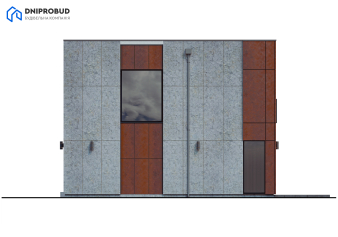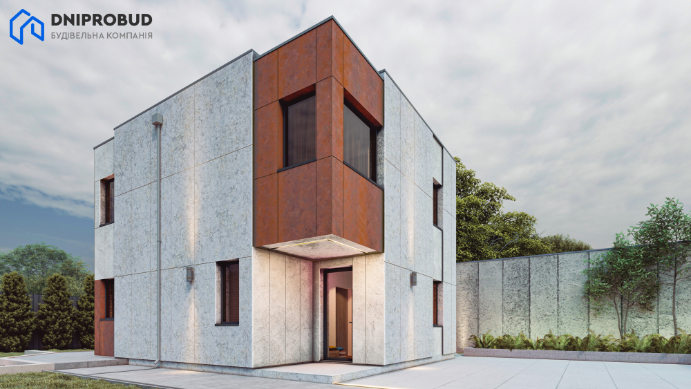 Сучасний двоповерховий будинок із чіткою геометрією та контрастними матеріалами фасаду. Поєднання світлих кам’яних панелей і теплого відтінку іржавої сталі надає будівлі виразності та індивідуальності. Великі панорамні вікна забезпечують природне освітлення й візуально збільшують простір. Другий поверх має еркер, що підкреслює архітектурну динаміку та створює додатковий внутрішній простір. Лаконічне оздоблення та приховані водостоки роблять будинок стильним і технологічним.