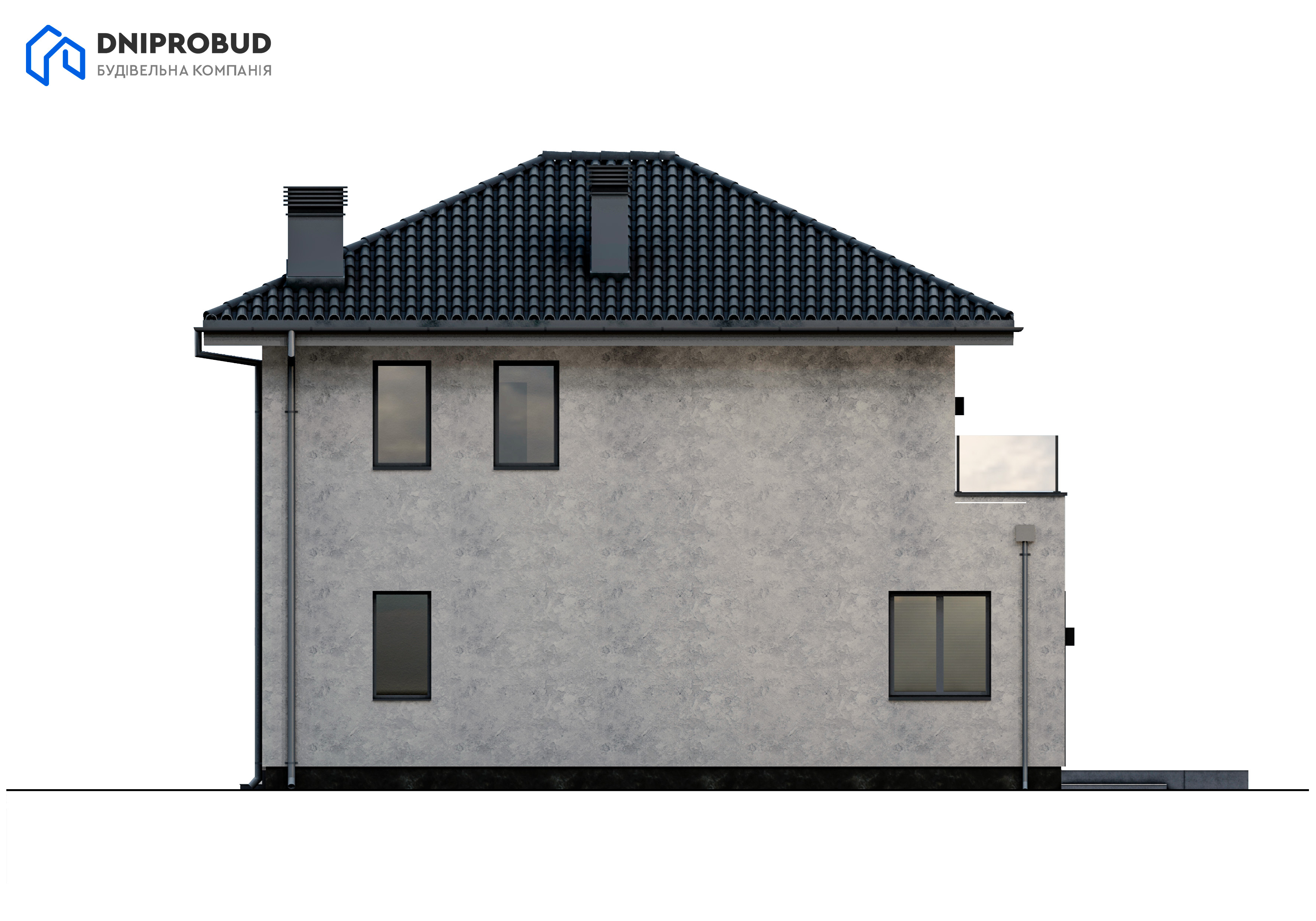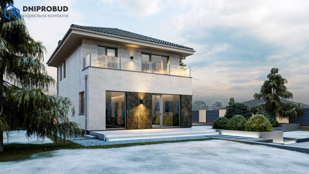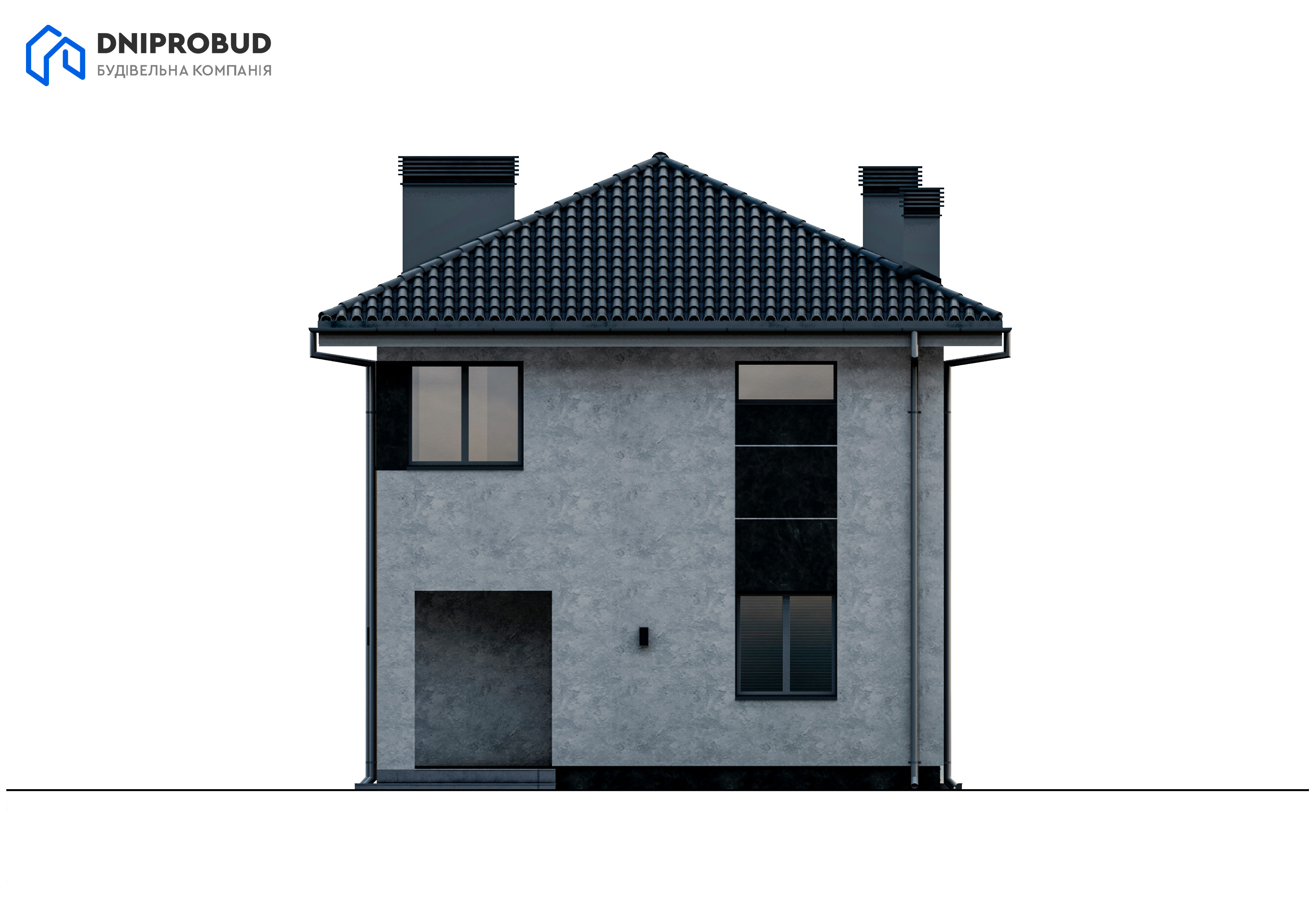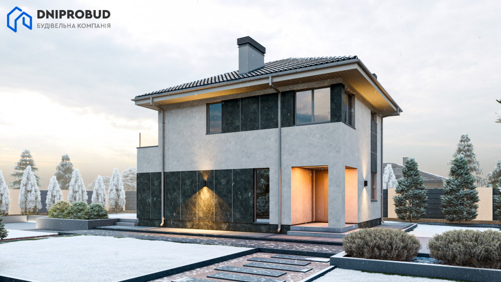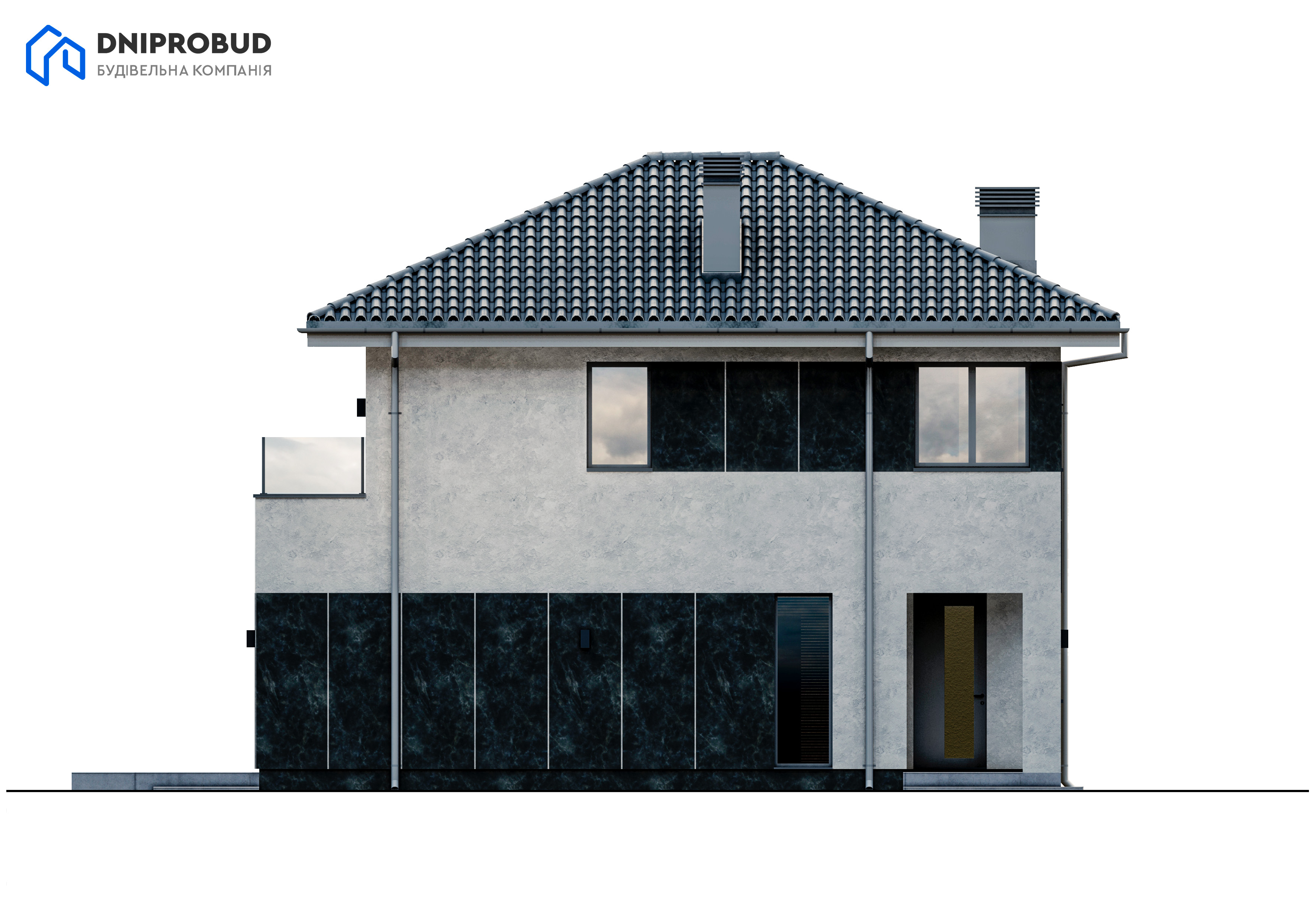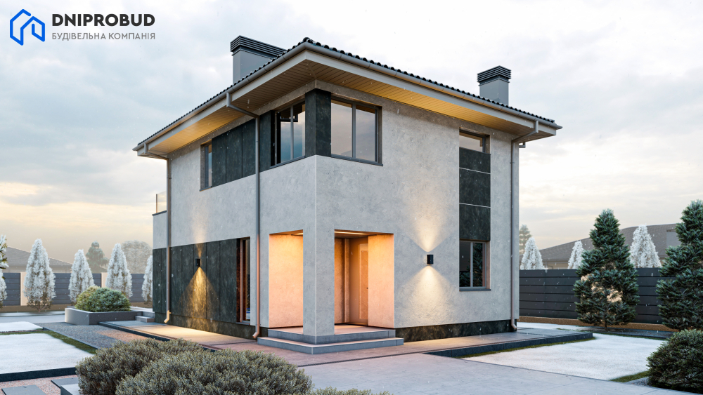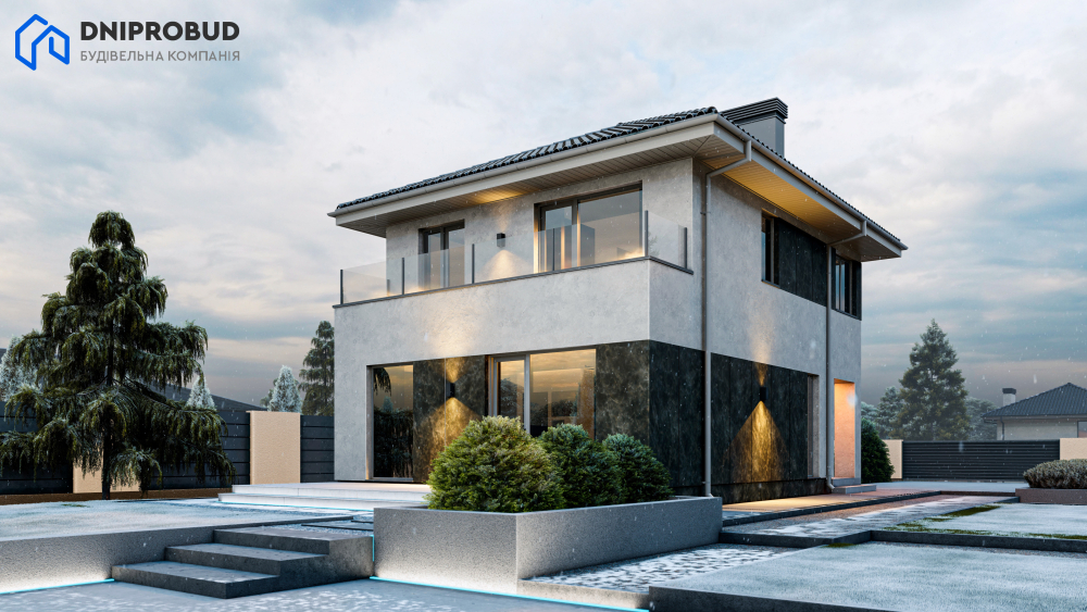 Двоповерховий будинок у сучасному стилі з елементами мінімалізму, що вирізняється чистими формами та контрастним оздобленням. Фасади оздоблені комбінацією світло-сірої мінеральної штукатурки та вертикальних вставок з темної глянцевої плитки, що створює виразний графічний контраст. Будинок має чотирисхилий дах з невеликим нахилом, покритий темною черепицею, з вираженими звісами. На другому поверсі розташований відкритий балкон з прозорою скляною огорожею. На першому поверсі передбачено велике панорамне скління, що забезпечує зв'язок з ландшафтом. Сучасне зовнішнє підсвічування підкреслюють сучасний вигляд.