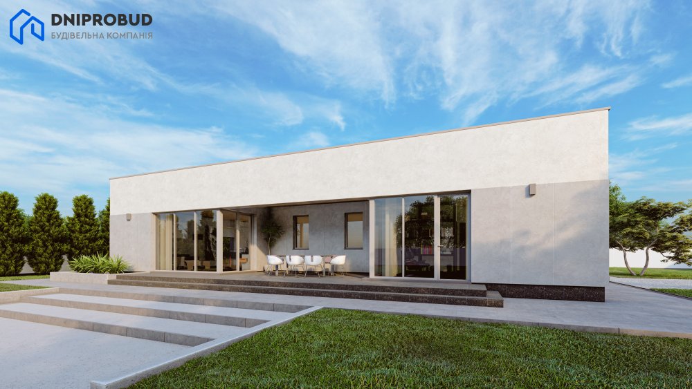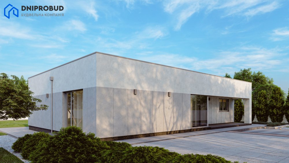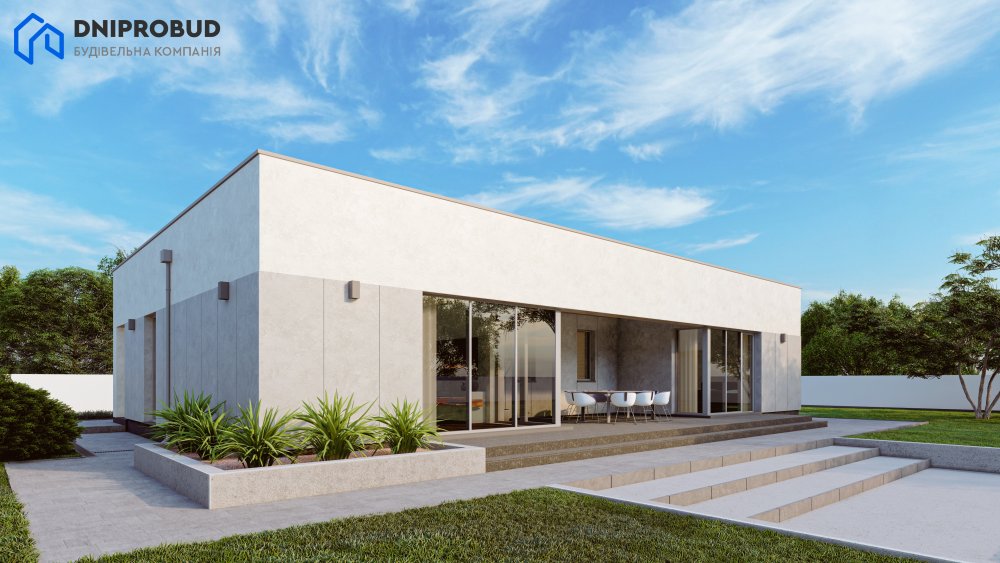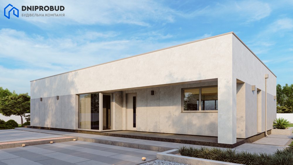 Сучасний одноповерховий будинок з плоским дахом, створений для комфортного сімейного життя без компромісів між стилем та зручністю. Його архітектура приваблює лаконічністю та правильними геометричними формами, характерними для стриманого мінімалізму. Фасад виконаний у спокійній двотонній гамі: гладка біла штукатурка верхньої частини гармонійно поєднується з фактурними світло-сірими панелями внизу. Великі панорамні вікна додають будівлі легкості, наповнюють кімнати денним світлом і візуально стирають межу між теплим інтер'єром та навколишнім двором. Справжньою окрасою екстер'єру є затишна крита тераса, інтегрована в загальний об'єм будинку, яка стане улюбленим місцем для ранкової кави або теплих вечірніх посиденьок.