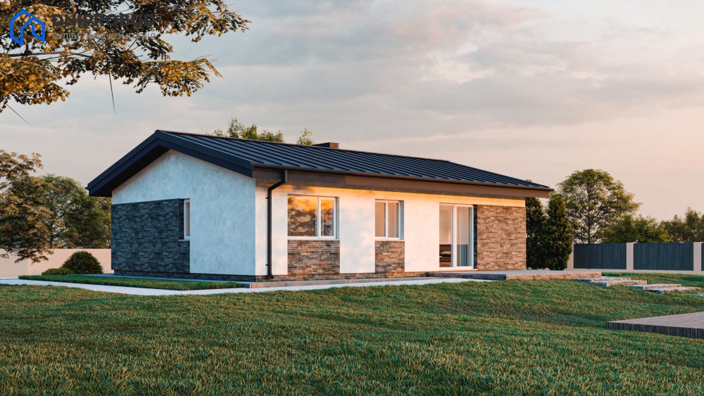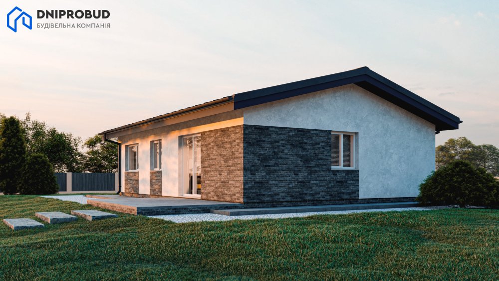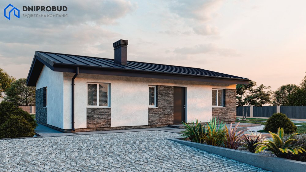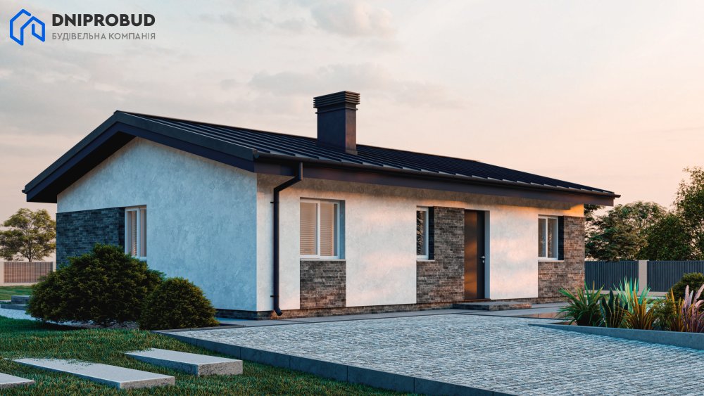 Компактний та функціональний будинок для родини з 3–4 осіб. Сучасна архітектура з лаконічними формами, акцентним облицюванням фасаду та двосхилим дахом створює затишний, але водночас стильний образ.