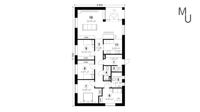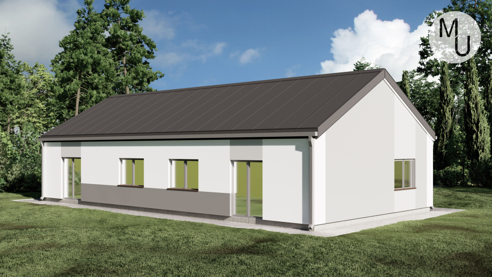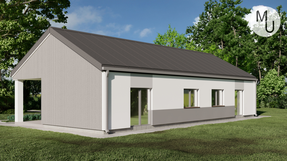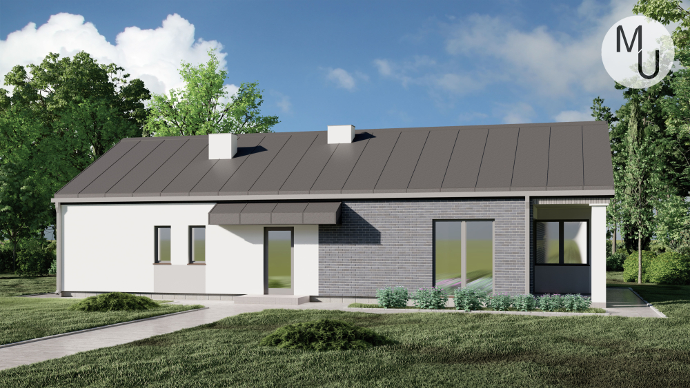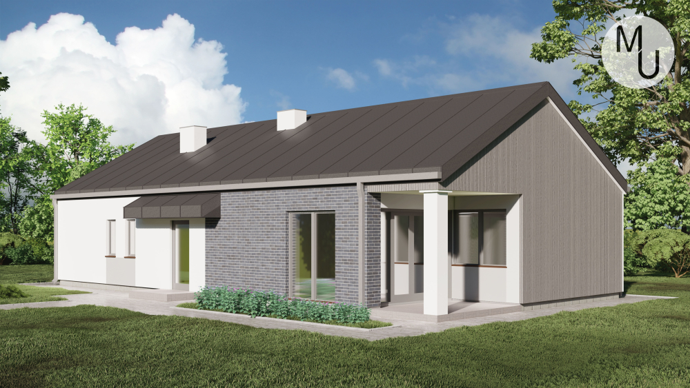Елегантний одноповерховий будинок, виконаний у скандинавському стилі. Проєкт простий, функціональний та з натуральних матеріалів. Фасад поєднує світлу штукатурку та декоративну цегляну кладку, що надає йому сучасного вигляду. Великі вікна наповнюють приміщення природним світлом.