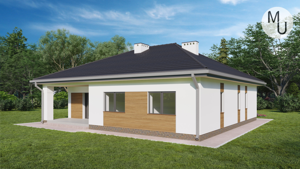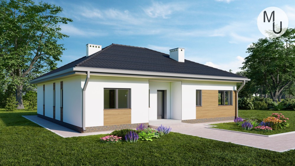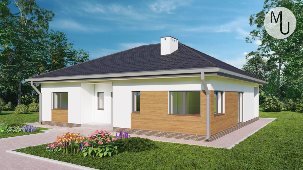 Сучасний, функціональний одноповерховий будинок, що гармонійно поєднує в собі просту та привабливу архітектуру, що ідеально вписується як у міський, так і в заміський ландшафт. Його фасади виконані в класичному поєднанні білої штукатурки та декоративних вставок з дерева, що надає будівлі тепла та затишку. Виразний і сучасний образ будинку створює контрастна темно-сіра чотирисхила покрівля і світлі фасади. Великі вікна не тільки забезпечують природне освітлення всередині, а й підкреслюють сучасний стиль проєкту. Будинок розрахований на комфортне проживання невеликої сім’ї, з ефективним використанням кожного квадратного метра. Цей проєкт ідеально підходить для тих, хто цінує функціональність, естетику та простоту форм.
