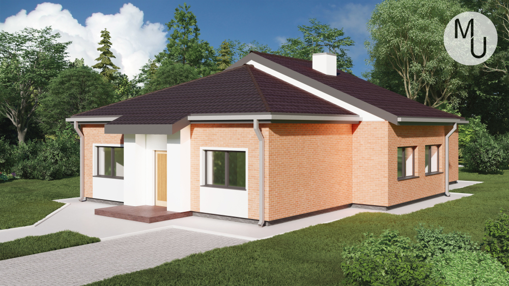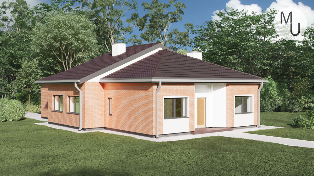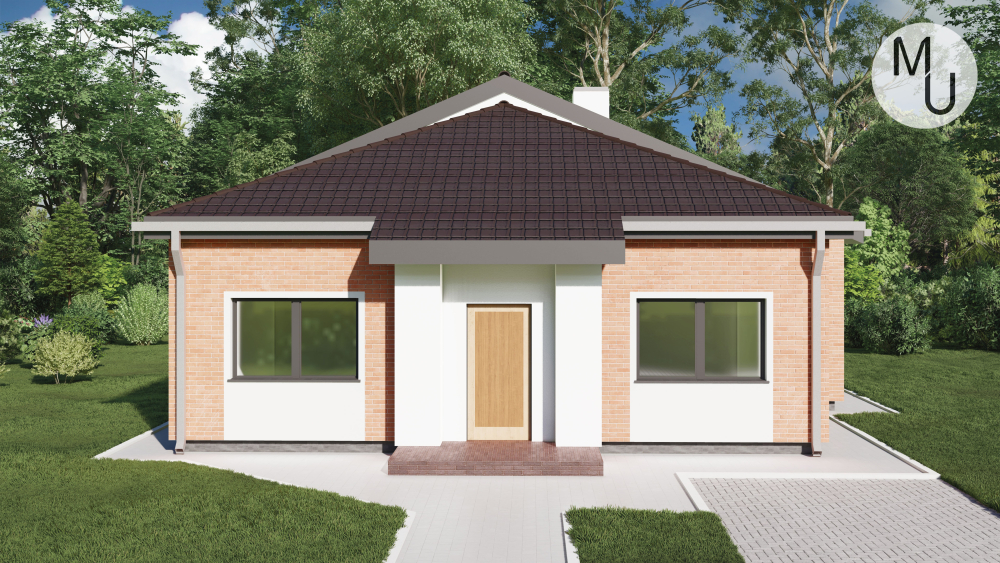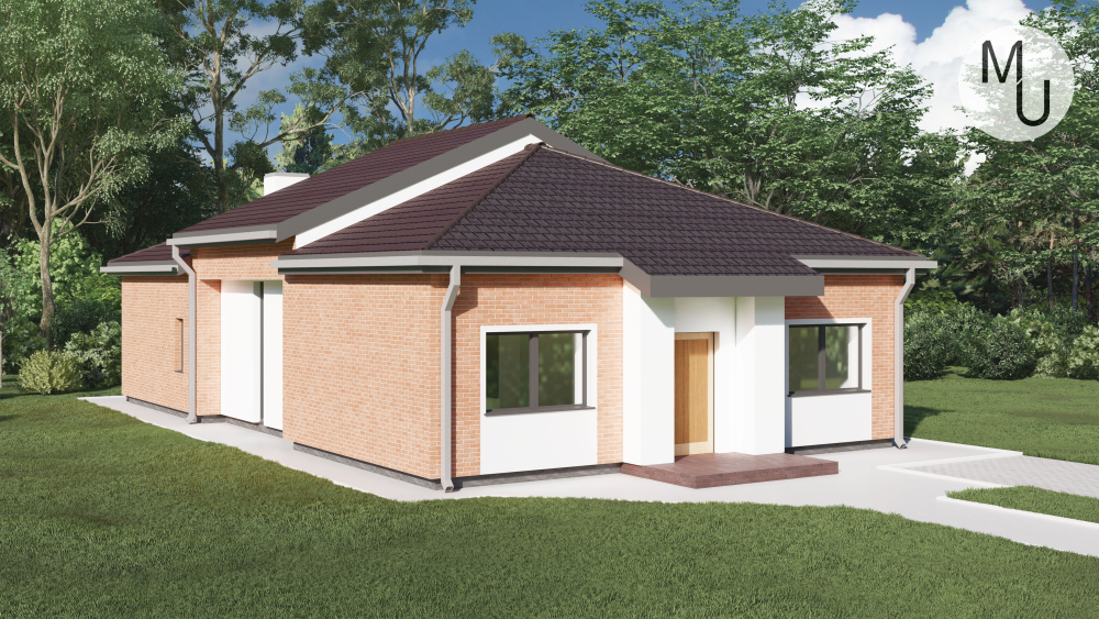 Компактний одноповерховий будинок у сучасному стилі. Фасади оздоблені червоною цегляною кладкою, що контрастує зі світлою штукатуркою. Акцент зроблено на центральному вході, виділеному білою штукатуркою та невеликим навісом. Багатосхилий дах з темної металочерепиці гармонійно поєднується з цегляним оздобленням.