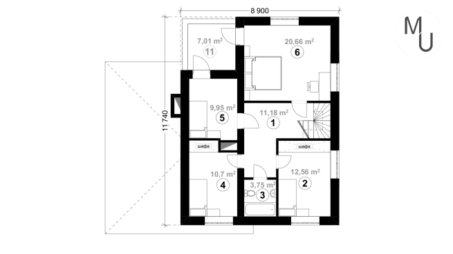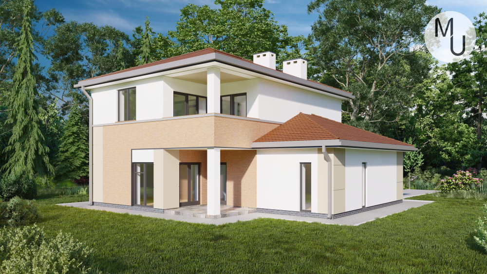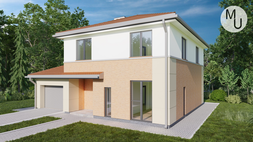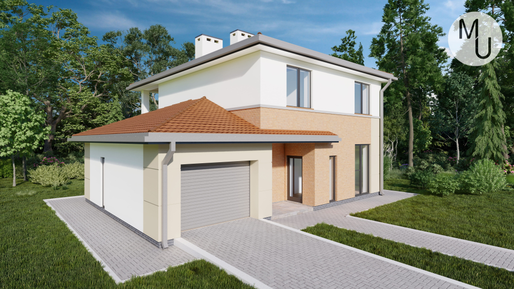 Комфортний двоповерховий будинок, що поєднує функціональність та естетику. Фасади облицьовані світлою штукатуркою, а другий поверх та деякі елементи першого оздоблені світлою цегляною кладкою. Будинок має багатосхилий дах та інтегрований гараж на один автомобіль, який забезпечує зручний доступ до будинку, що особливо практично в негоду. Великі вікна наповнюють приміщення природним світлом.