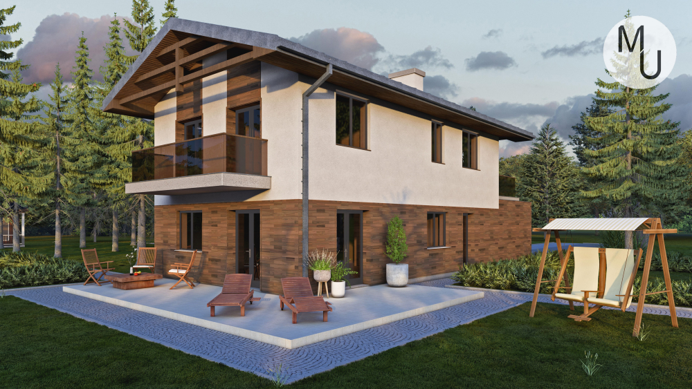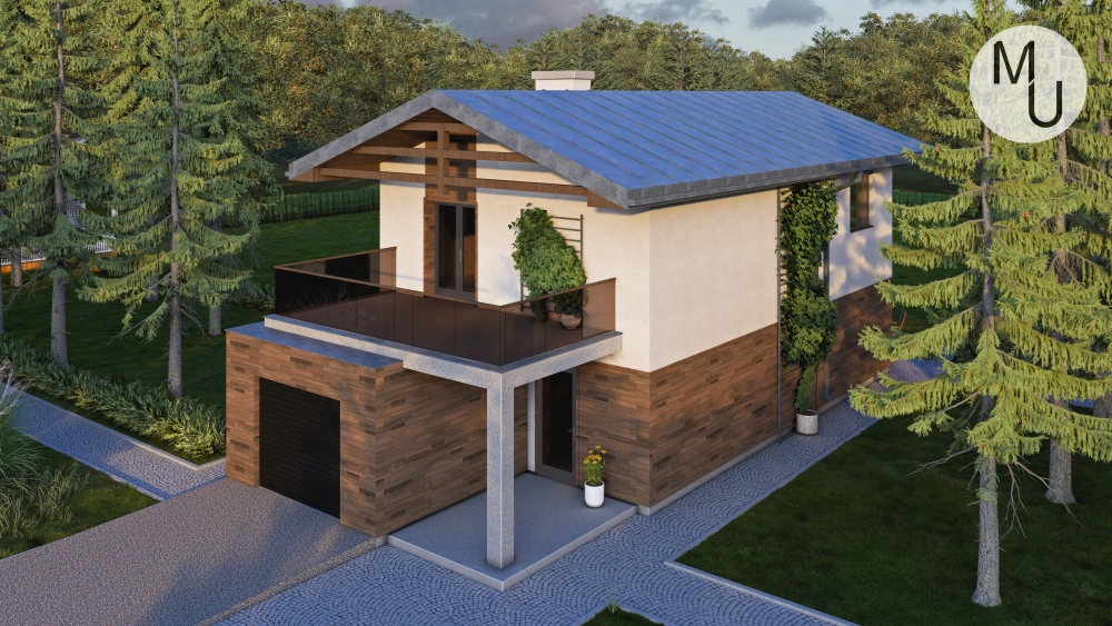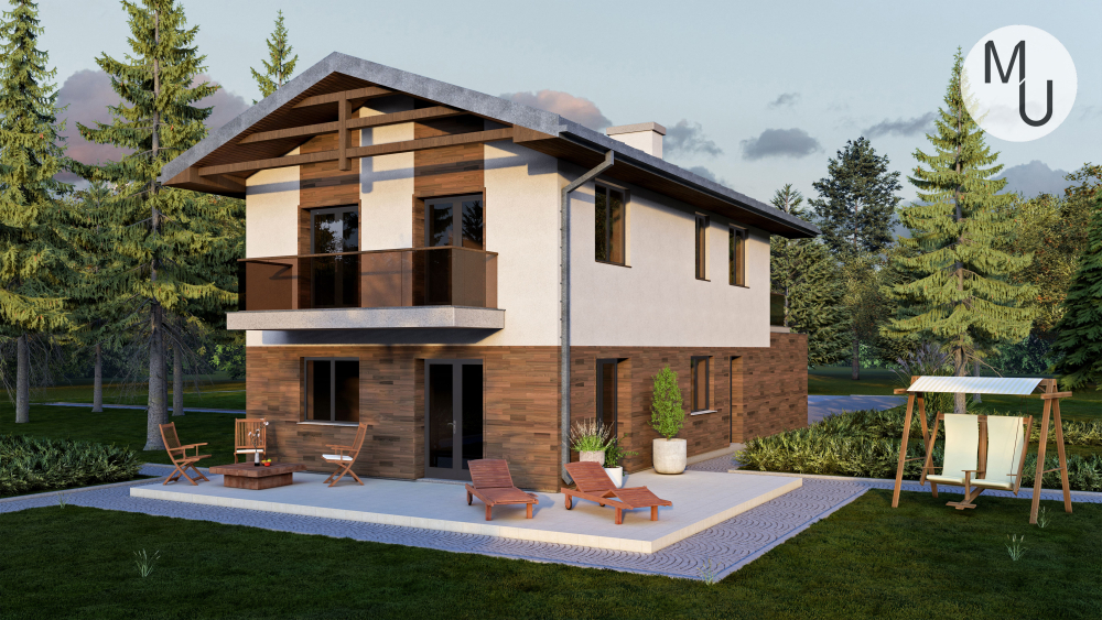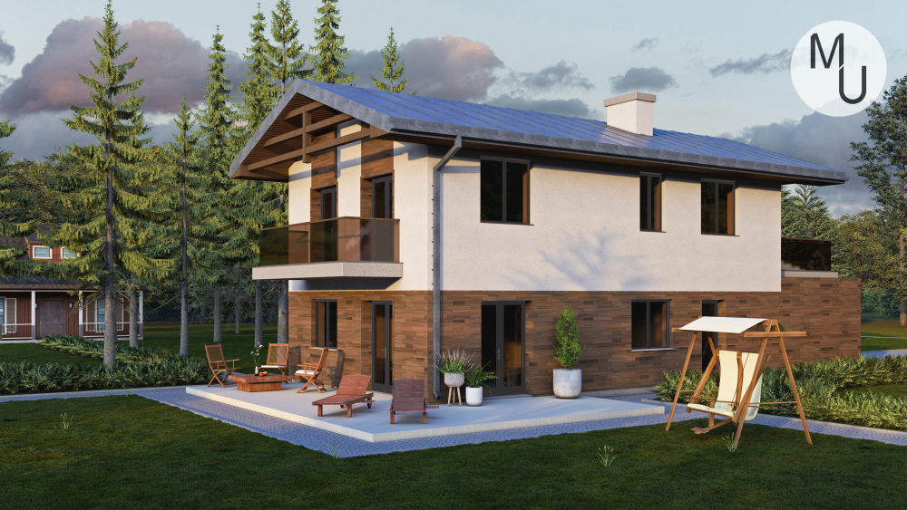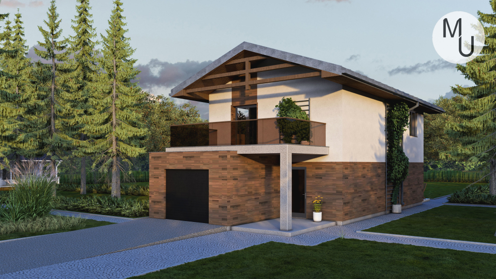 Двоповерховий будинок у скандинавському стилі з виваженою та деталізованою архітектурою. Фасад будинку виконаний комбіновано: нижня частина оздоблена дерев'яними панелями, а верхня — світлою штукатуркою. Акцентною є велика тераса на першому поверсі та балкон на другому, що мають скляні огорожі, ідеальні для відпочинку.