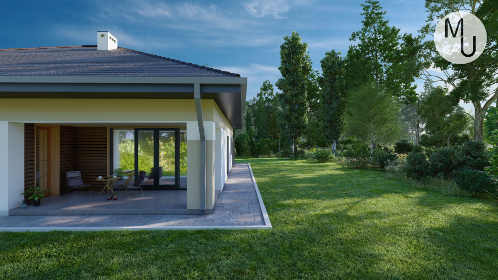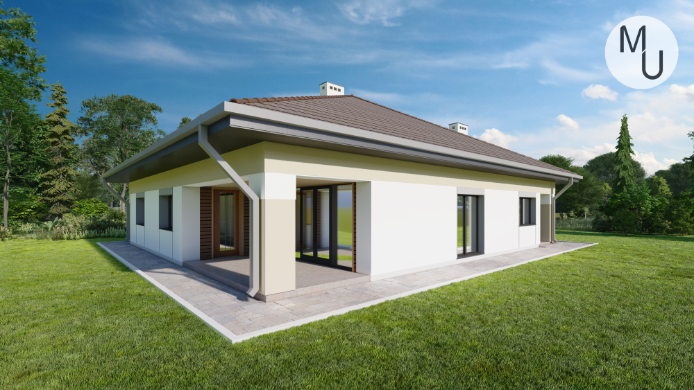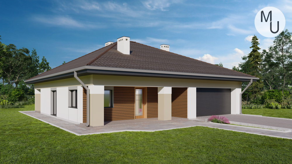 Сучасний одноповерховий будинок, що поєднує в собі стиль та функціональність. Простий та елегантний дизайн підкреслює сучасний підхід до будівництва. Фасад будинку виконаний у світлій штукатурці з дерев'яними елементами, що надає йому затишного вигляду. Крита тераса ідеально підходить для організації літньої їдальні або зони відпочинку. Будинок також має гараж на два автомобілі, який з'єднаний з іншими приміщеннями через котельню, що додає зручності у повсякденному використанні.