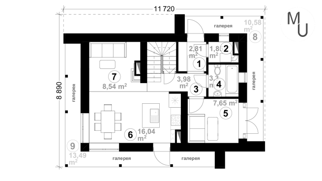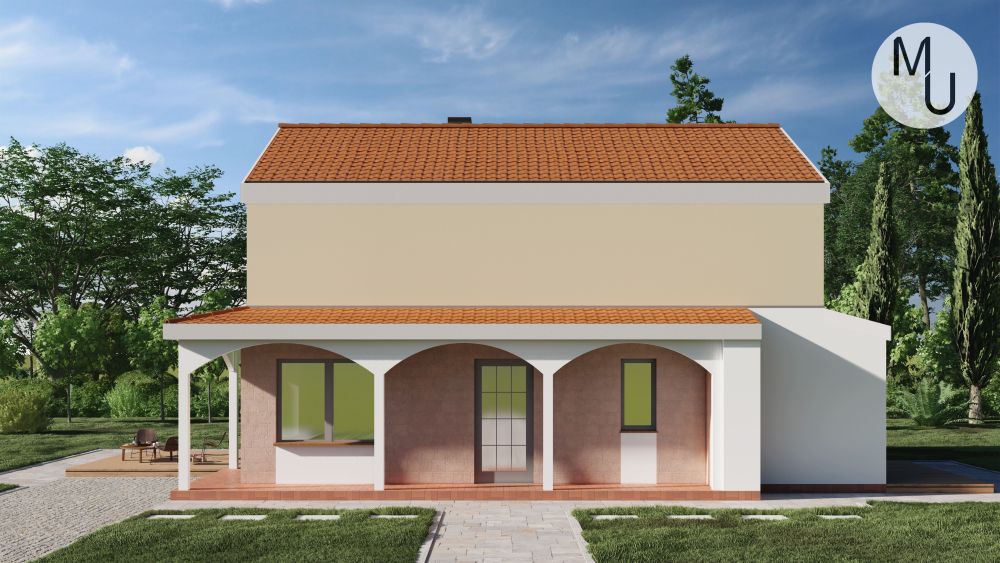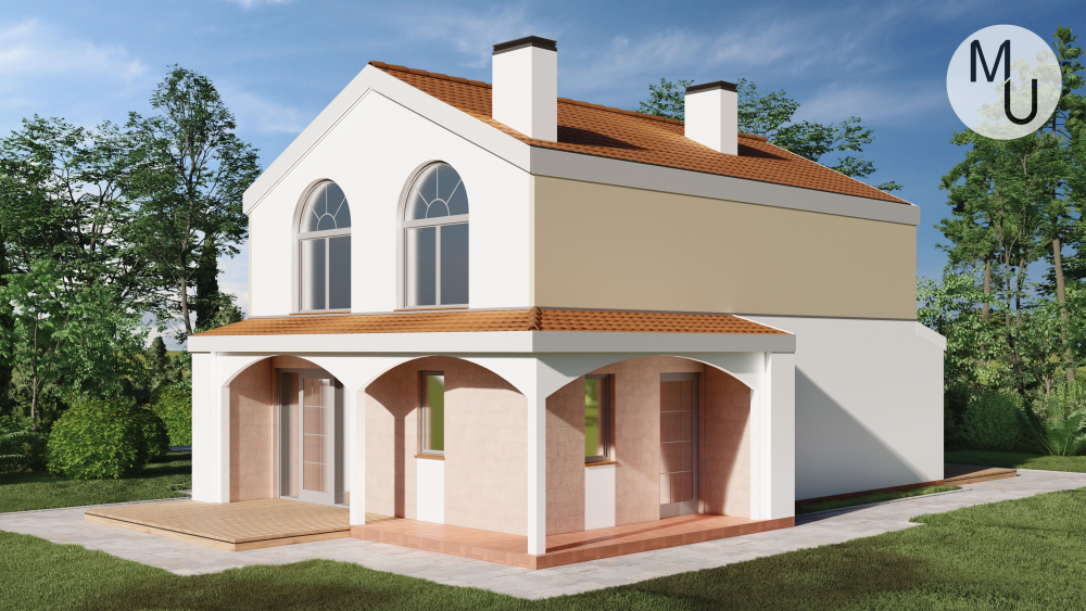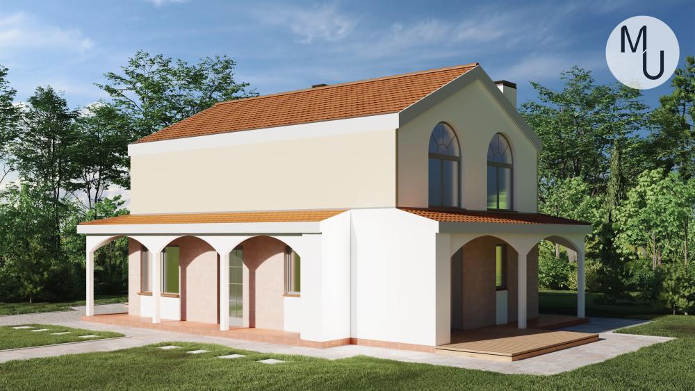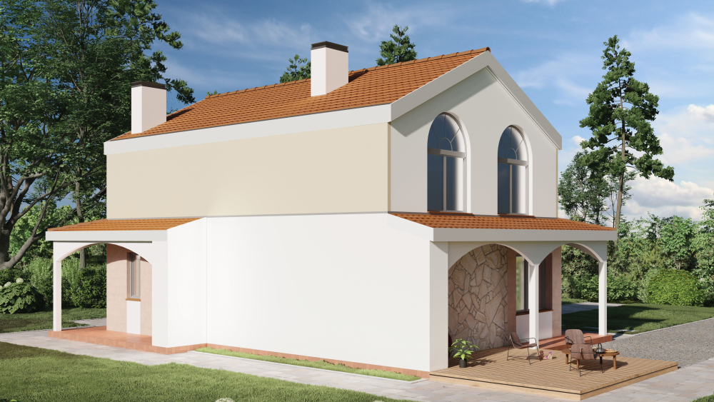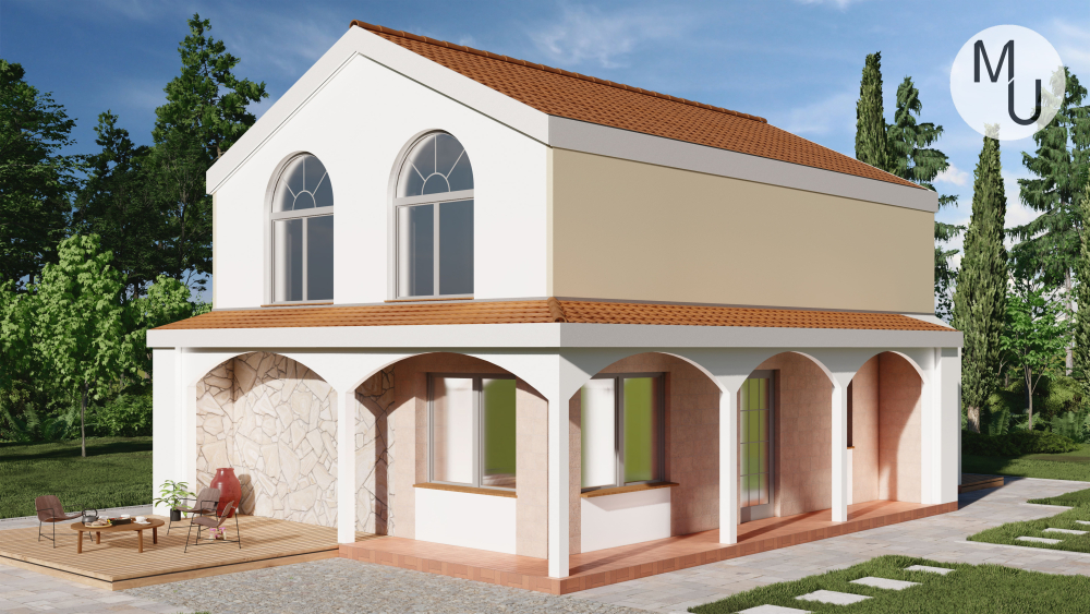 Проєкт двоповерхового будинку в середземноморському стилі, що проявляється у світлих теплих відтінках фасаду. Це ідеальне поєднання елегантності та функціональності. Фасад будинку оздоблено світлою штукатуркою з декоративним кам’яним облицюванням. Акцент зроблено на великій критій терасі, що огинає будинок. Вона має вихід як з вітальні, так і з кабінету, ідеально підходить для відпочинку чи сімейних вечер. Мансардний дах з черепиці та арочні вікна на другому поверсі доповнюють загальний вигляд, а великі панорамні вікна наповнюють інтер'єр природним світлом.
