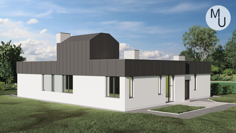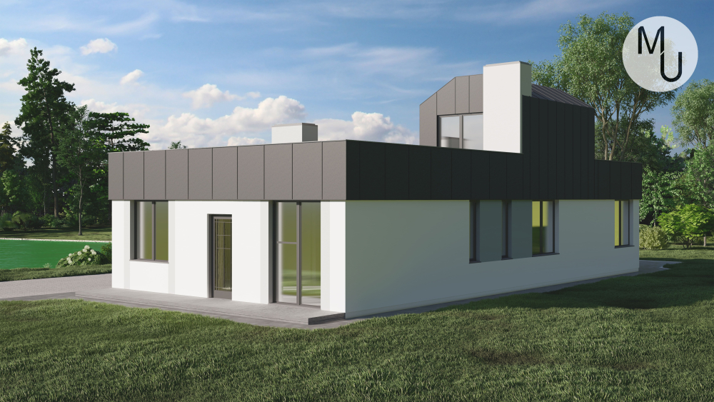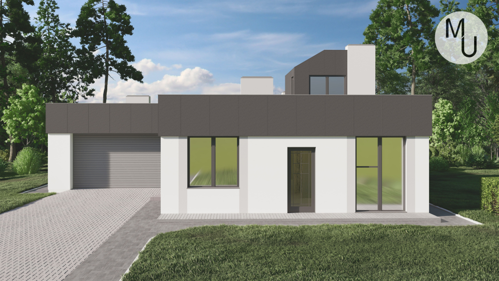 Компактний одноповерховий будинок у сучасному мінімалістичному стилі. Фасад поєднує білу штукатурку та темно-сірі панелі, що створює строгий та елегантний вигляд. Будинок має плоский дах з центральною висунутою частиною, яка покрита фальцевим покриттям і візуально створює мансардний простір. У проєкт інтегровано гараж на два автомобілі. Завдяки панорамним вікнам будинок наповнюється природним світлом, що додає затишку та комфорту.