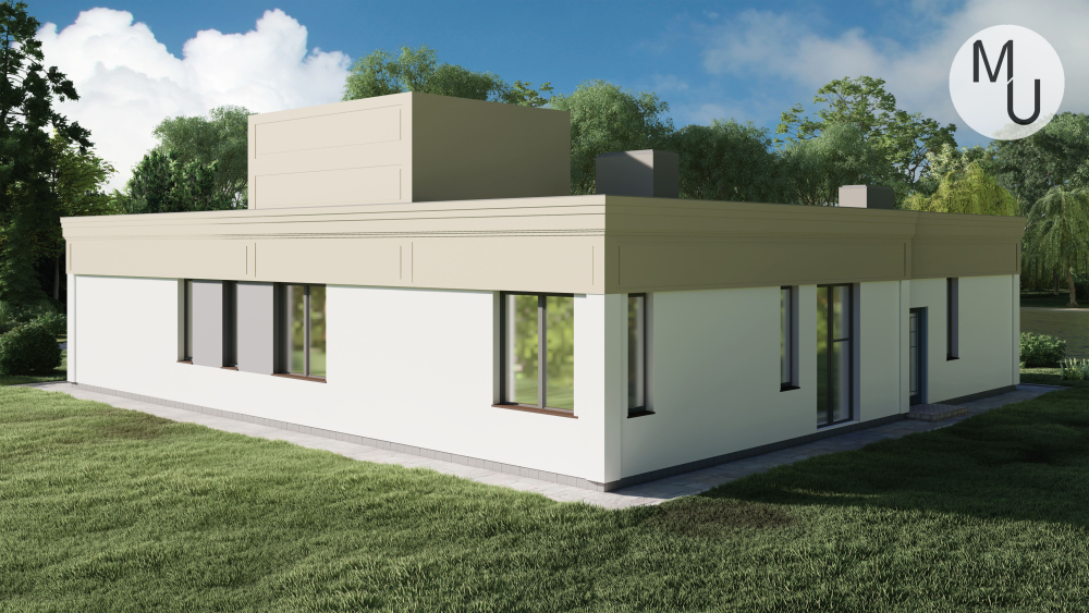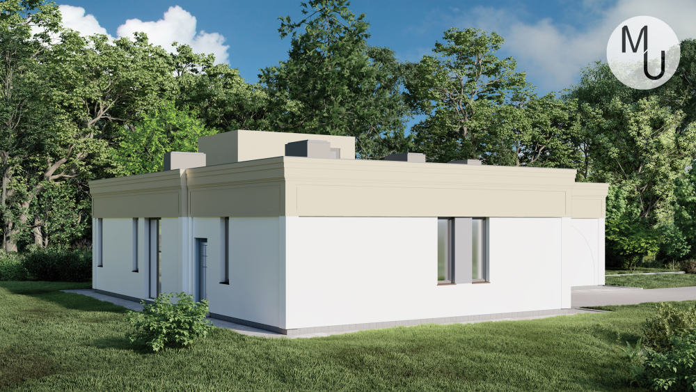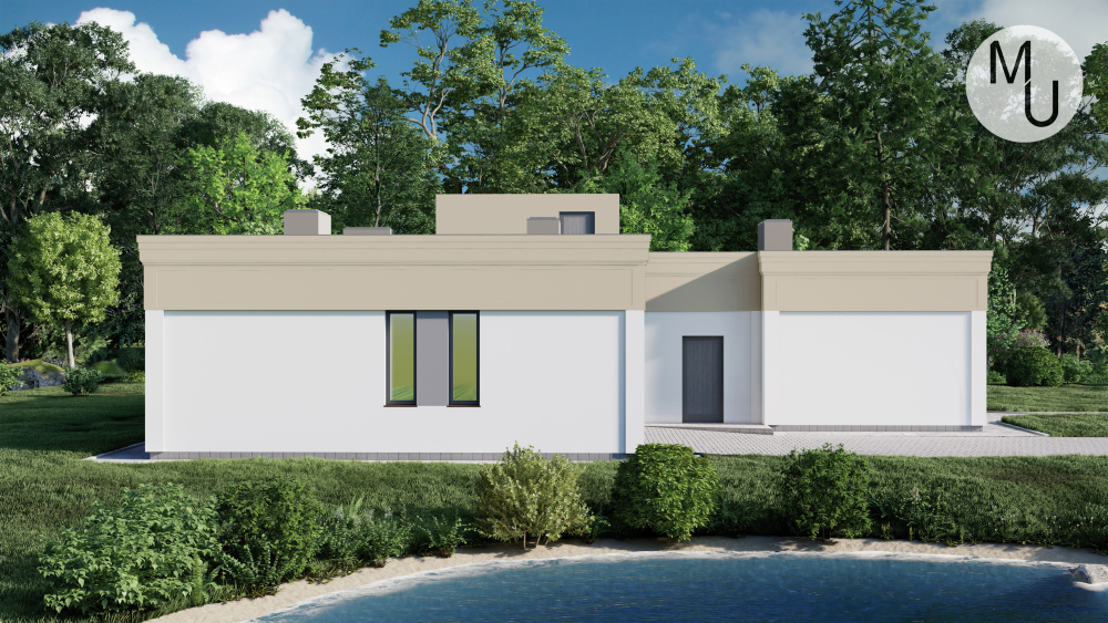 Проєкт одноповерхового будинку «Каркасон» виконаний у середземноморському стилі. Загальна площа становить 182 м², що забезпечує достатньо простору для комфортного проживання. Фасад будинку оздоблено світлою штукатуркою з горизонтальним бежевим поясом. Основною особливістю є плоский дах, який повністю задіяний як тераса. Таке рішення створює чудове місце для відпочинку на свіжому повітрі та сімейних обідів. Проєкт також включає гараж на два автомобілі.