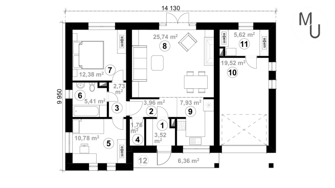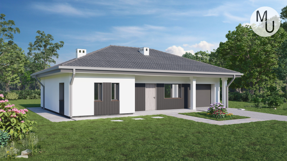 Одноповерховий будинок у європейському стилі, призначений для невеликої сім’ї. Він відрізняється простотою, функціональністю та мінімалістичним дизайном. Фасад будинку виконаний у світлій штукатурці з темними декоративними елементами та вікнами. Дах чотирисхилий, покритий темною металочерепицею.