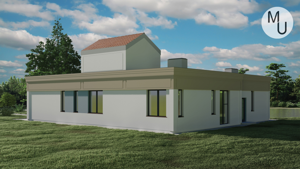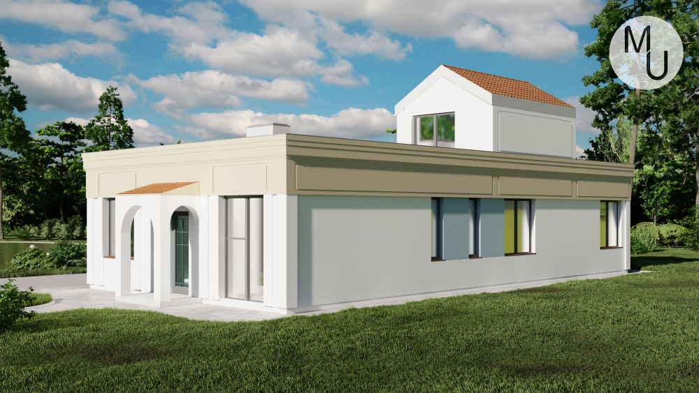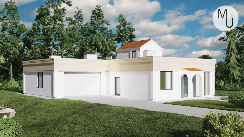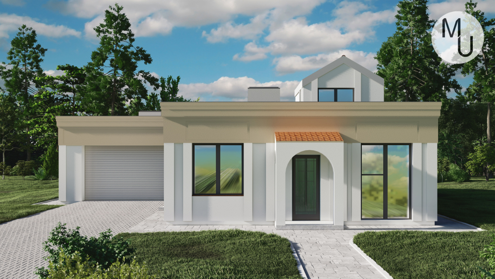 Компактний одноповерховий котедж з елементами середземноморського стилю. Фасад поєднує білу та світло-бежеву штукатурку, а також невеликі акценти з червоної черепиці над входом. Характерними рисами є арочні ніші та вікна, що надають будівлі особливого шарму. Основною особливістю є плоский дах, який повністю задіяний як тераса з мансардною вставкою, вкритою черепицею. У проєкт також включено гараж.