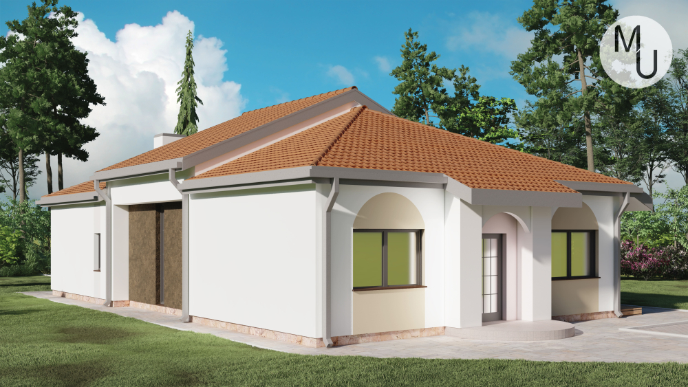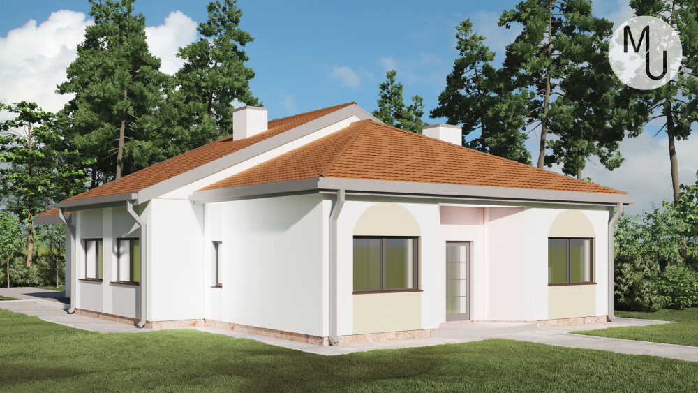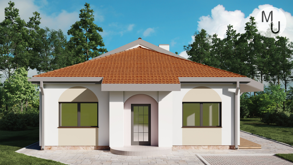 Компактний одноповерховий котедж у сучасному європейському стилі. Фасади оздоблені світлою штукатуркою з бежевими акцентами та декоративним кам'яним цоколем. Характерними елементами є арочні вікна та виділений вхідний портал. Дах будинку покритий помаранчевою черепицею, що додає йому тепла та затишку.