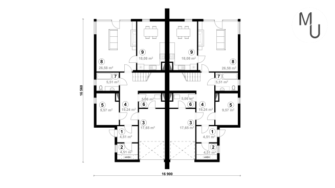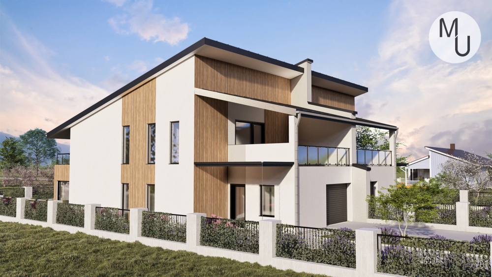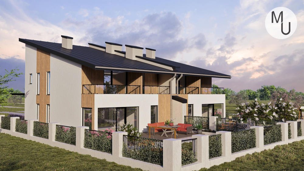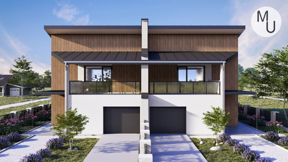 Двоповерховий дуплекс, ідеальний для двох сімей, що шукає комфортне та стильне житло. Кожна секція будинку має окремий вхід, власний гараж, терасу та балкон, що забезпечує повну автономність. Архітектурна форма навіяна європейським стилем, з використанням комбінованих фасадних матеріалів: світла штукатурка та дерев’яні панелі. Кожна половина будинку має по два балкони, що дозволяє насолоджуватися краєвидами в різні пори дня.