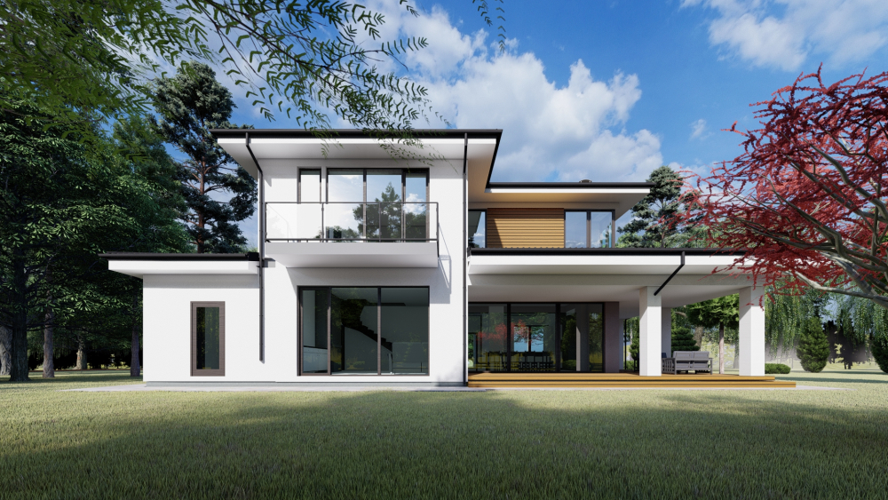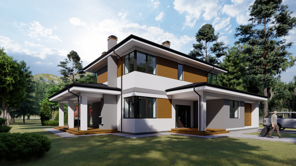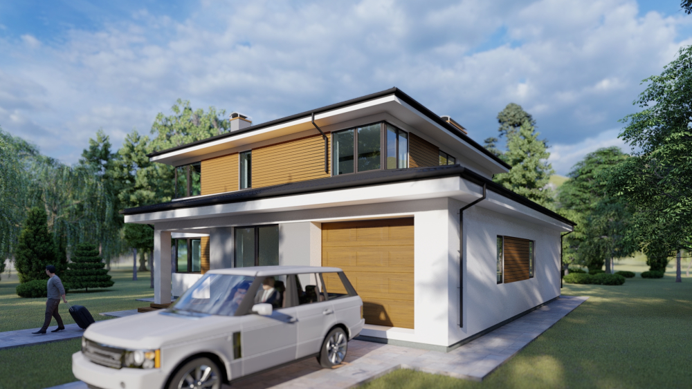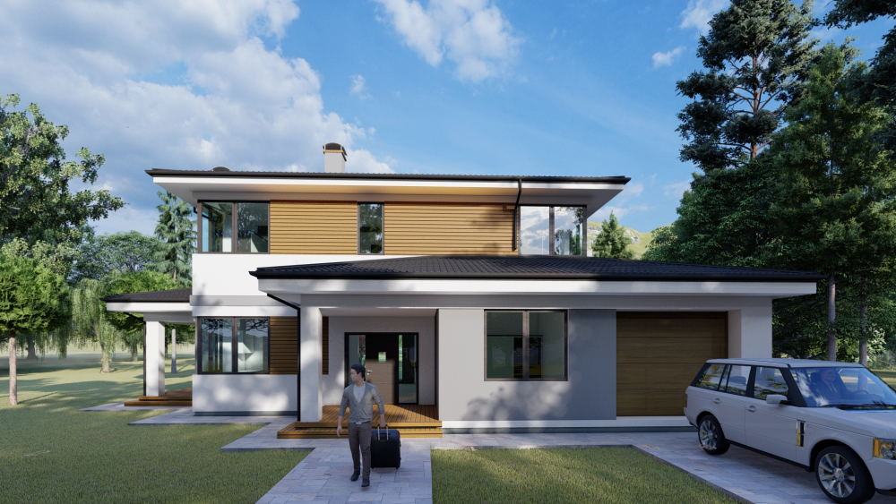 Сучасний двоповерховий котедж з мінімалістичним дизайном, що поєднує білу та світло-сіру штукатурку з дерев'яними акцентними вставками на другому поверсі. Будинок має малосхилий дах з вираженими карнизами та велике панорамне скління, що забезпечує багато природного світла. Особливістю є простора крита тераса з білими колонами, що охоплює частину будинку, де можна організувати літню вітальню та барбекю-зону. Проєктом передбачений гараж на одне авто та затишний вхідний ґанок.