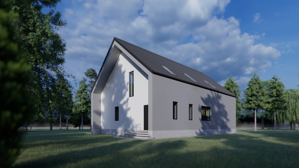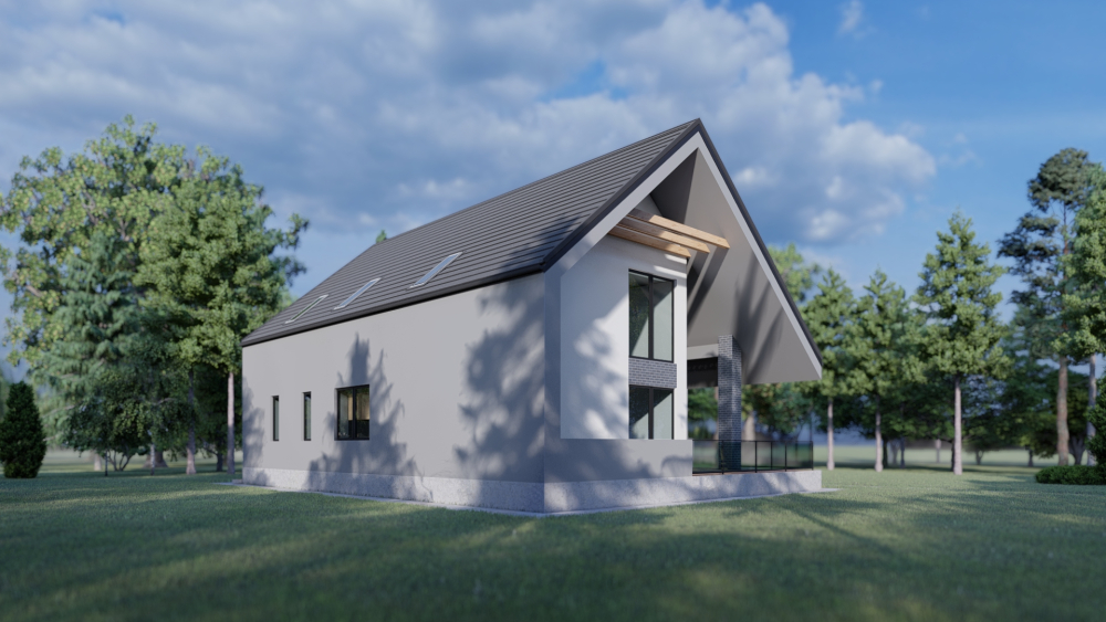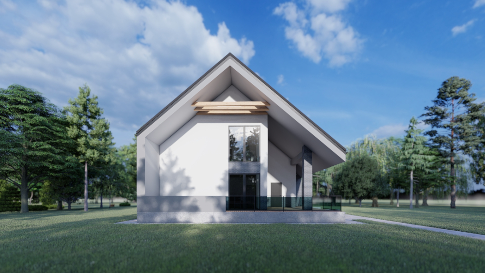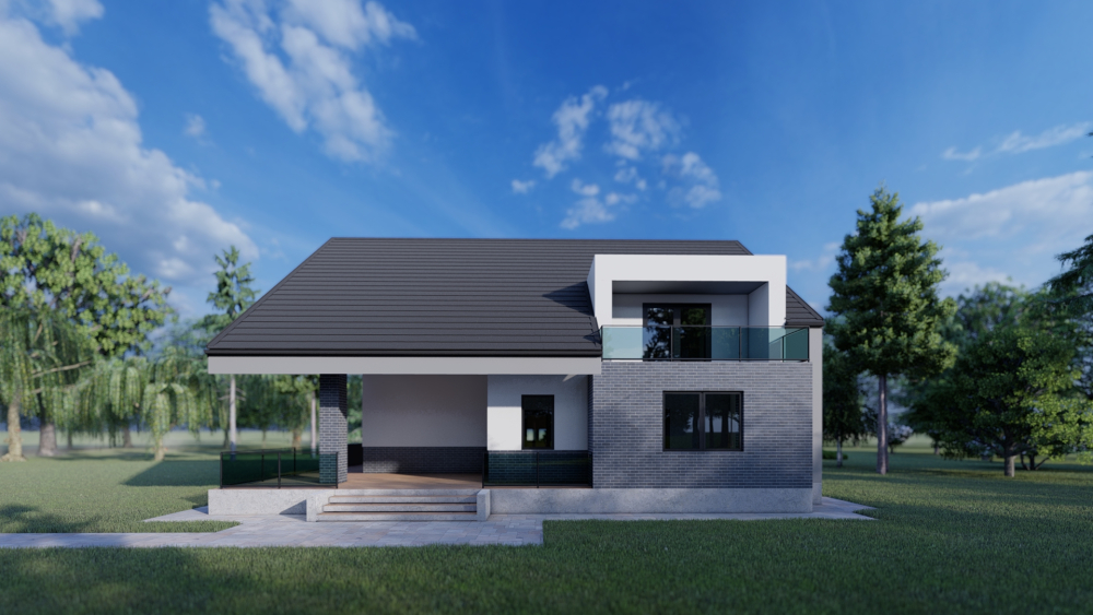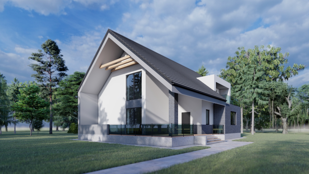 Сучасний двоповерховий котедж із двосхилим дахом, виконаний у стриманій комбінації світлої штукатурки та темного облицювального кирпича. Великі панорамні вікна забезпечують максимальне природне освітлення. Простора тераса з прозорими скляними огорожами плавно поєднує внутрішній простір із природою. На другому поверсі розташований балкон з виходом із спальні, що створює затишну зону для відпочинку на свіжому повітрі.