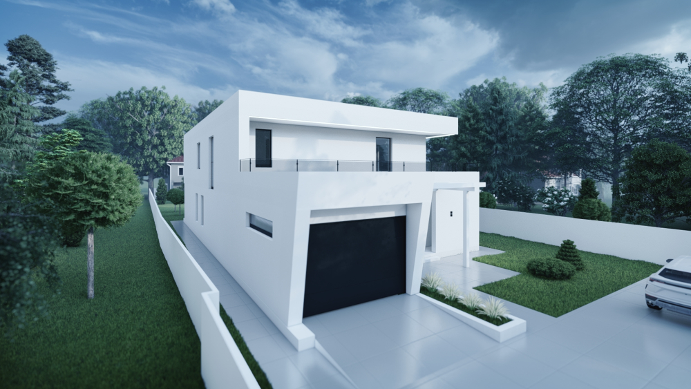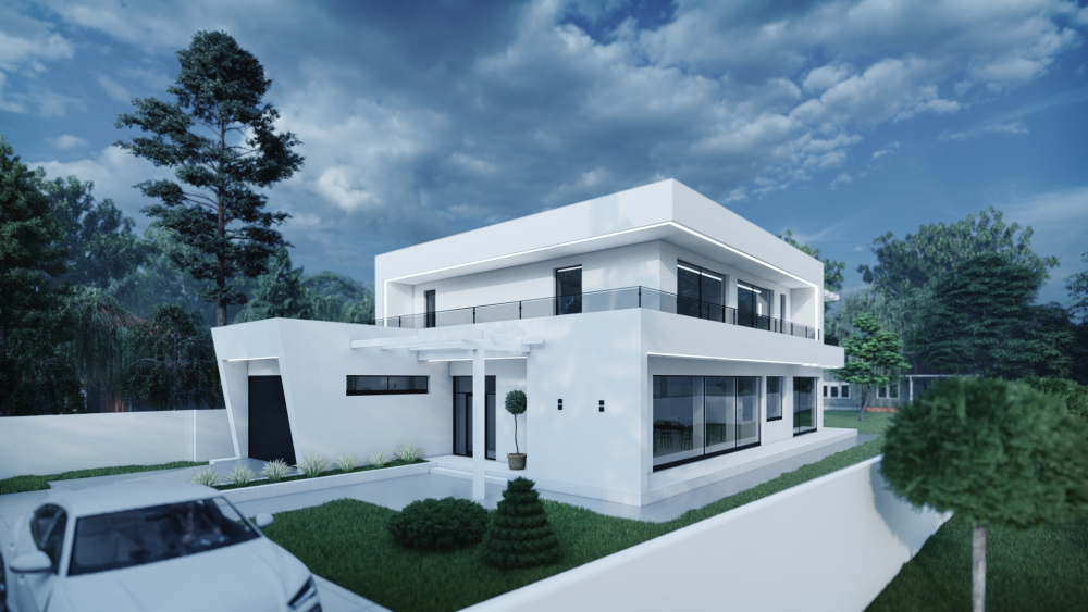 Сучасна двоповерховий будинок, що вирізняється чистою геометрією, білими фасадами та плоским дахом. Головний акцент зроблено на масштабному панорамному склінні по всьому першому поверху, що забезпечує максимальне проникнення світла та стирає межі між інтер'єром та зовнішнім простором. Елементи зовнішнього підсвічування надають будинку футуристичного вигляду вночі. На другому поверсі розташовані відкриті тераси з прозорими скляними огорожами, частково затінені білими дерев'яними перголами. Фасад включає інтегрований гараж з контрастними чорними воротами та елегантно оформлений вхідний ґанок.