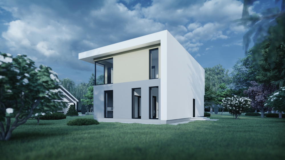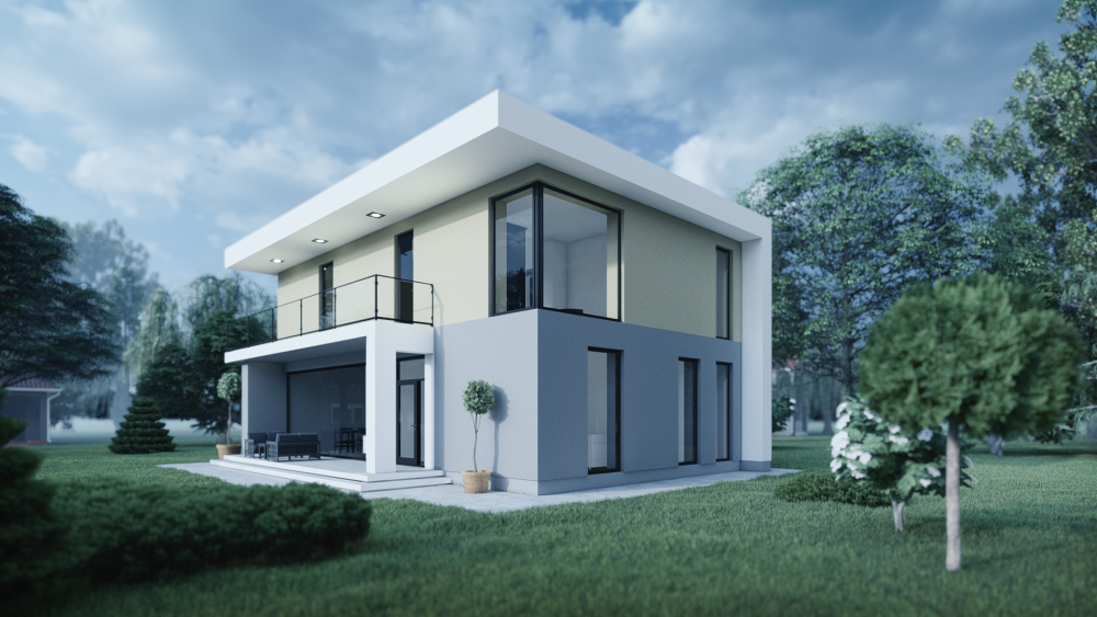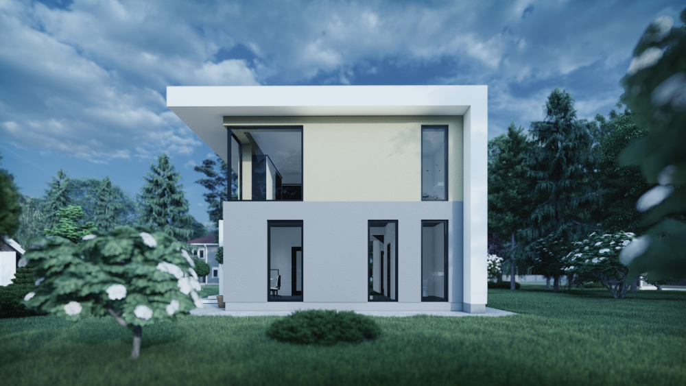 Сучасний двоповерховий будинок з лаконічним дизайном, що поєднує сіру штукатурку на першому поверсі та пісочну на другому. Проєкт має плоский дах і мінімалістичну форму, підкреслену великими панорамними вікнами та скляними дверима, що забезпечують максимальне освітлення. Головні акценти — простора крита тераса на першому поверсі для відпочинкової зони та балкон на другому поверсі зі скляною огорожею.