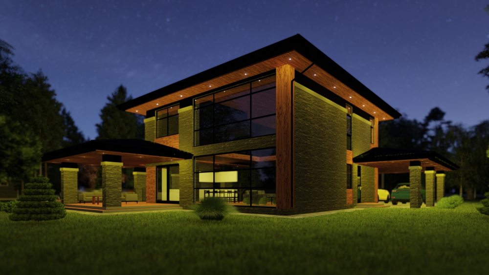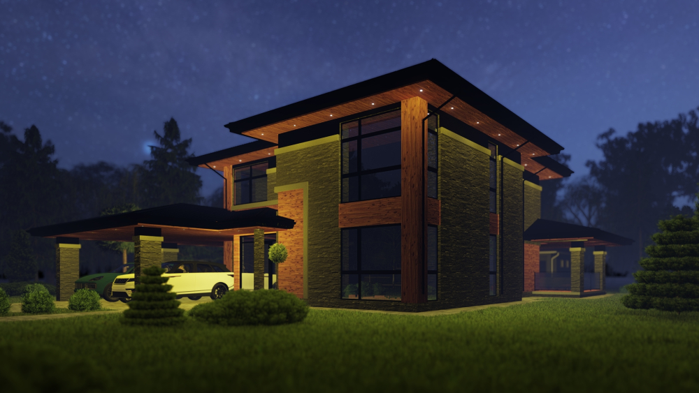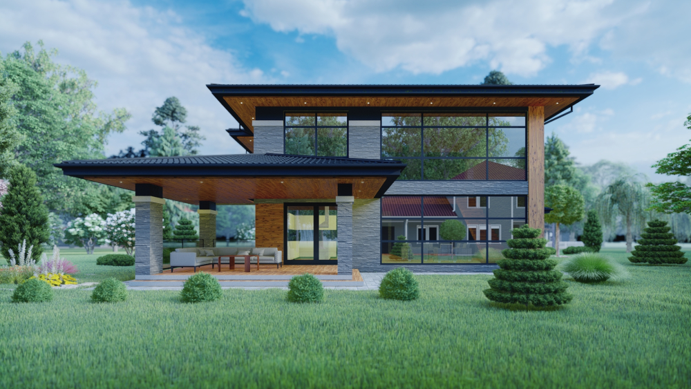Просторий двоповерховий будинок у сучасному стилі з акцентом на горизонтальних лініях. Фасад виконано з комбінації фактурного сірого каменю та декоративних елементів з теплого дерева. Характерна риса — виносний дах з темним покриттям та підшивкою з дерева, що створюють затишну криту терасу та навіс для автомобілів. Будинок має велику площу скління, включаючи панорамні вікна, котрі забезпечують максимальну інтеграцію інтер'єру з навколишнім ландшафтом.
