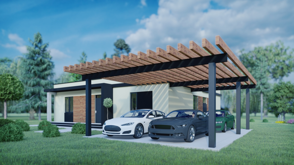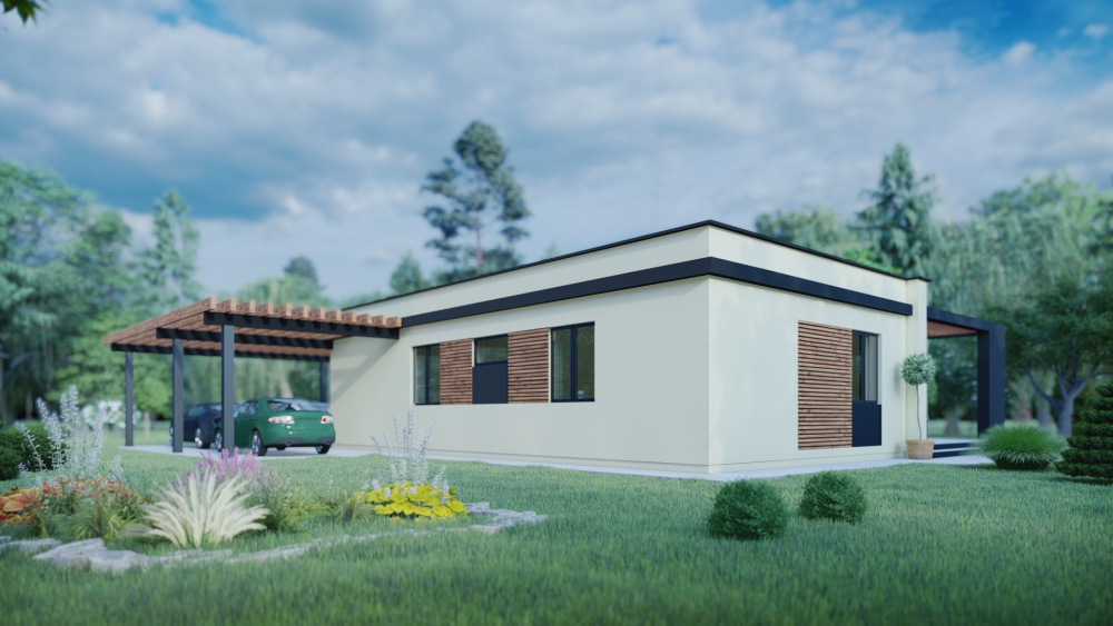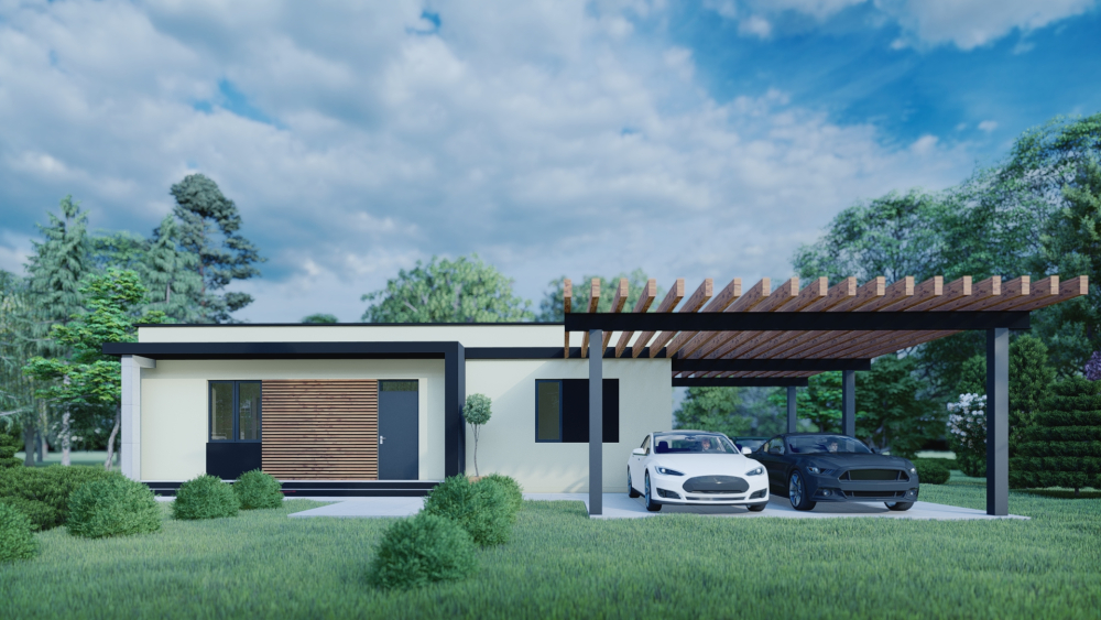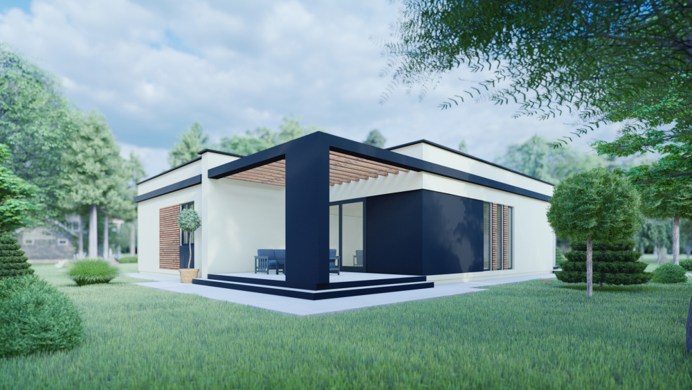 Сучасний одноповерховий будинок з акцентом на функціональність і простоту форм. Фасади виконані в світлих тонах із поєднанням декоративної штукатурки та дерев’яних елементів. Основною архітектурною особливістю є плоский дах, що підкреслює сучасний характер будинку. Простора вітальня з виходом на криту терасу формує зону для сімейного відпочинку.