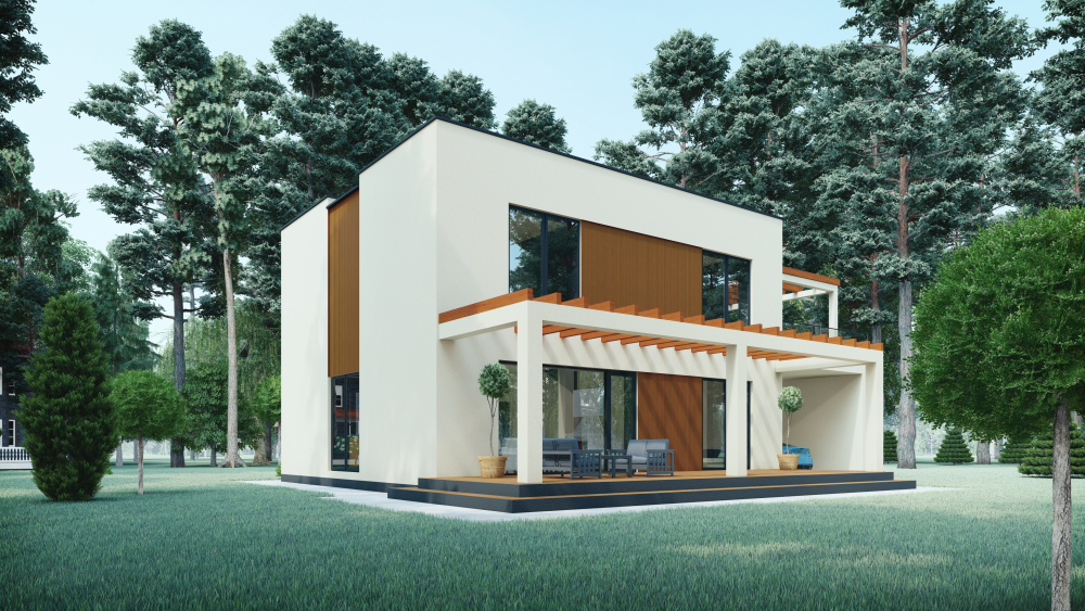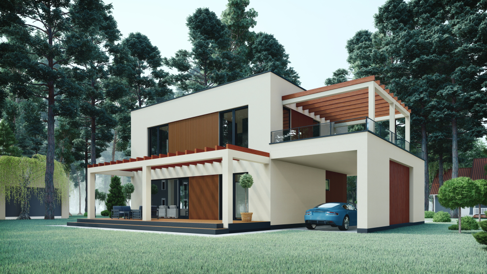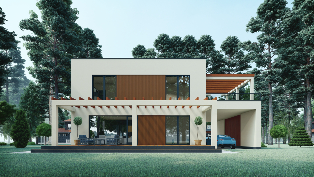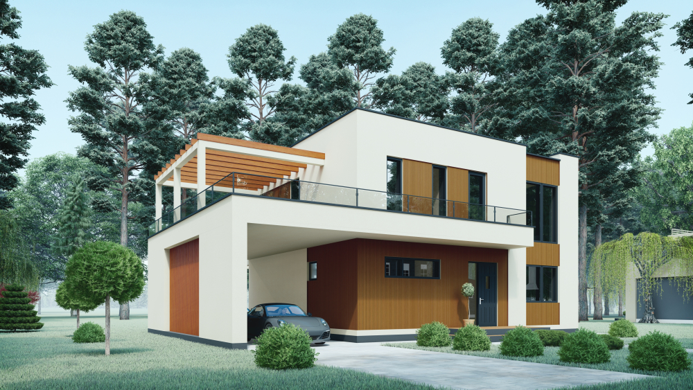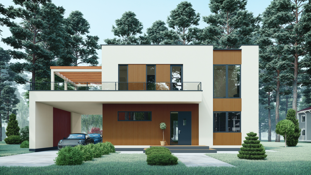 Сучасний двоповерховий будинок, що вирізняється чіткими кубічними формами та контрастним поєднанням матеріалів. Основне оздоблення фасадів – світла штукатурка, що ефективно доповнюється великими вертикальними вставками з натурального дерева теплого відтінку. Будинок має криту зону для паркування на першому поверсі. Акцент – на двох просторих терасах, обидві обладнані дерев'яними перголами: одна на першому поверсі, інша – на другому, з мінімалістичною скляною огорожею.