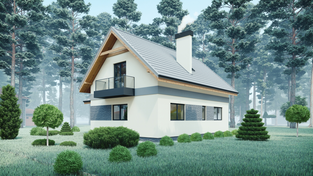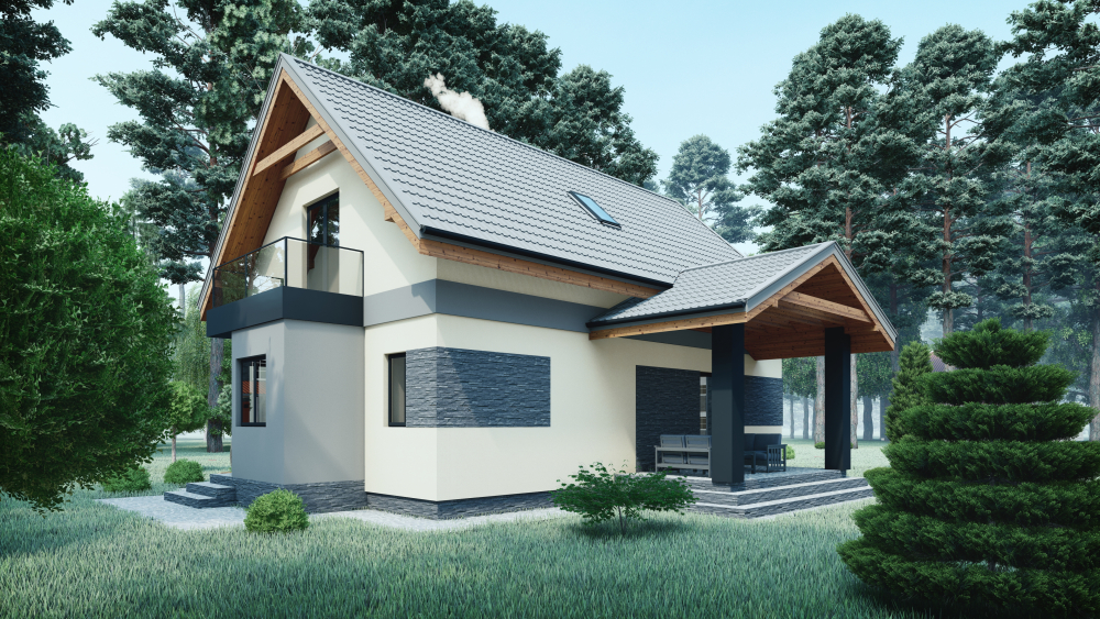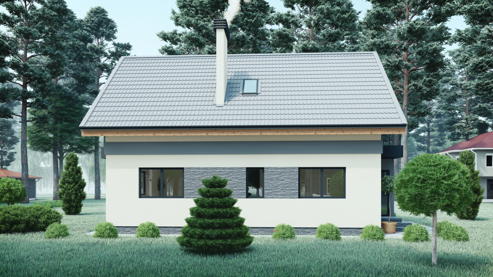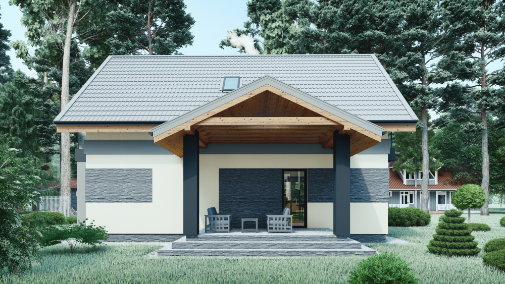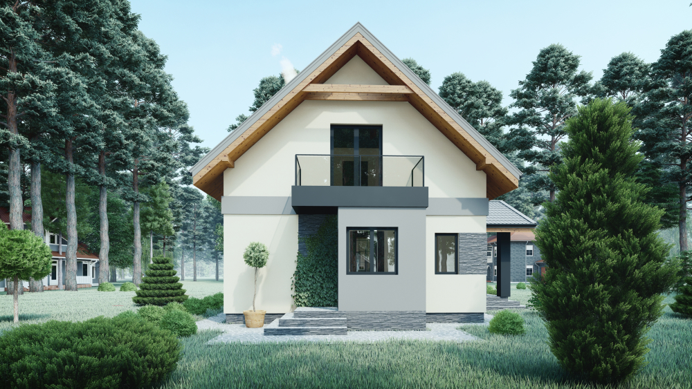 Двоповерховий будинок з мансардою. Фасади виконані у світлій штукатурці з декоративними вставками з темного каменю та горизонтальними сірими акцентами. Дах — чотирьохсхилий, покритий металочерепицею сірого кольору, з виступаючими дерев’яними кроквами. Родзинка проєкту — затишна критa тераса з виходом у сад та балкон на другому поверсі, що додає будинку сучасності та функціональності. Великі вікна забезпечують максимальне природне освітлення.
