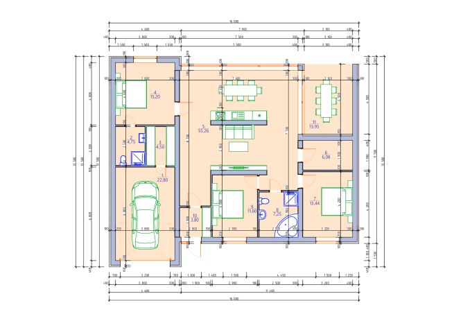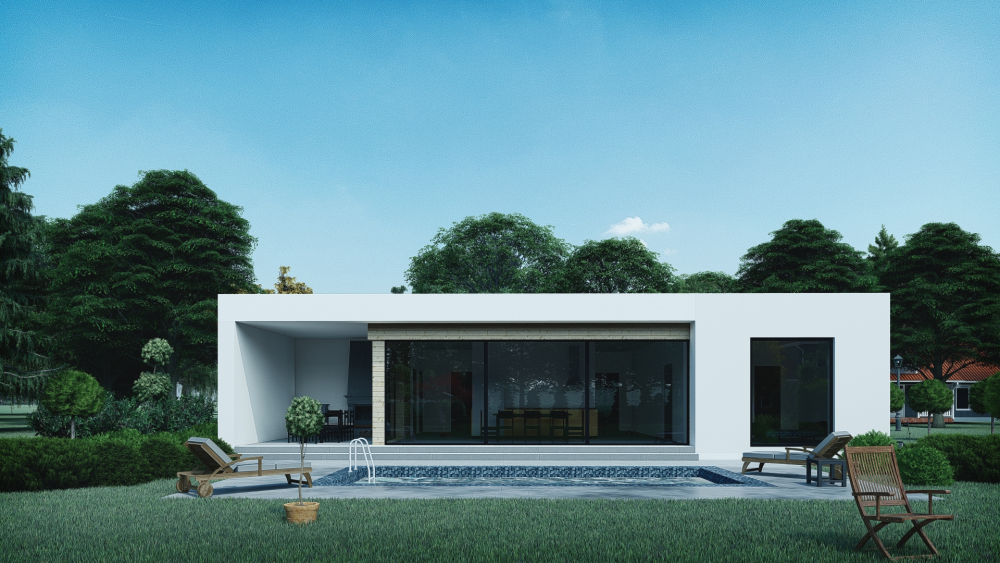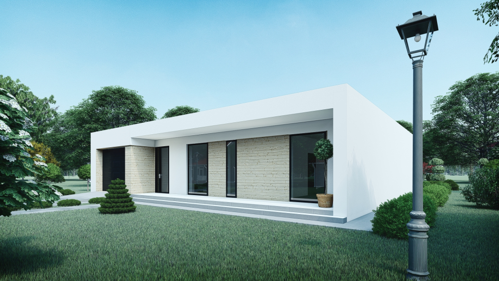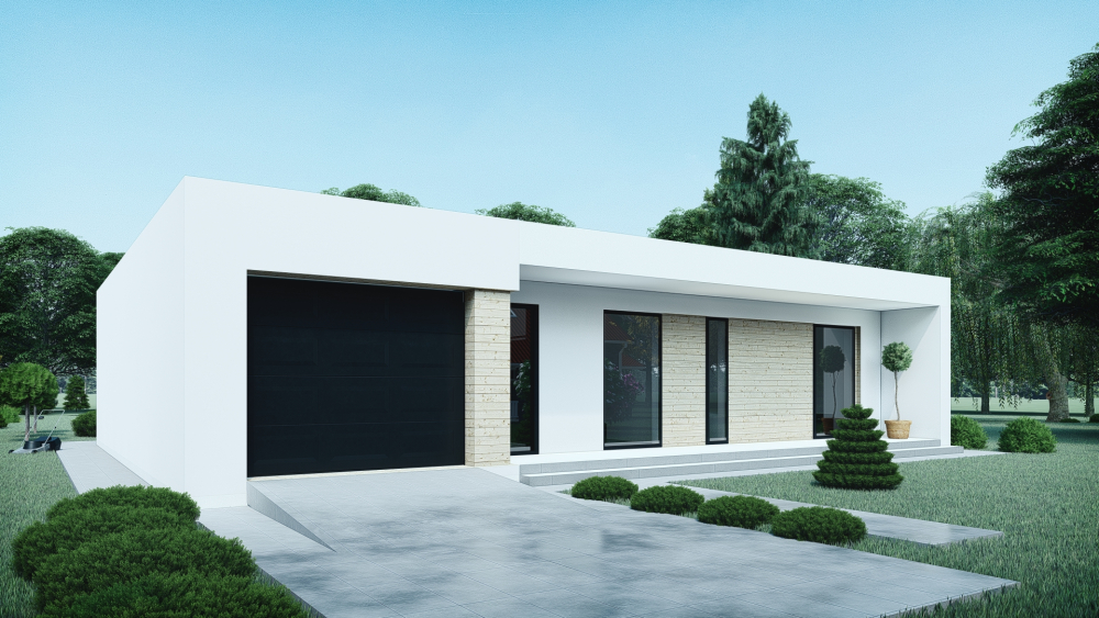 Комфортабельний одноповерховий котедж у сучасному мінімалістичному стилі з інтегрованим гаражем. Фасади виконані зі світлої гладкої штукатурки та горизонтальних дерев’яних панелей. Плоский дах підкреслює сучасний характер будівлі, а панорамні вікна забезпечують багато природнього світла.