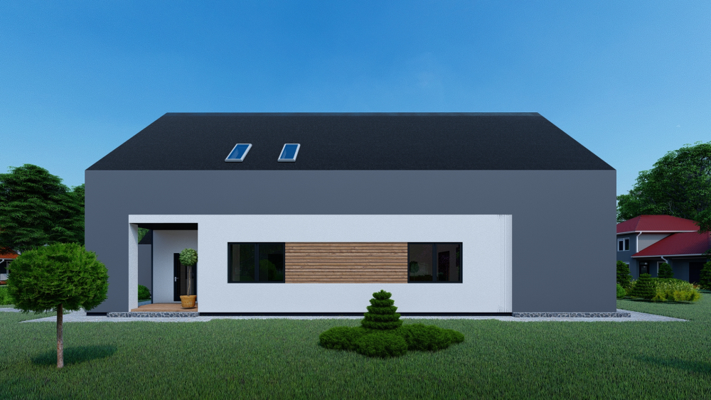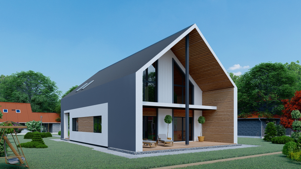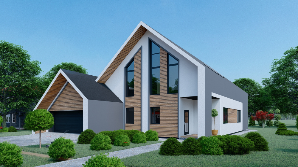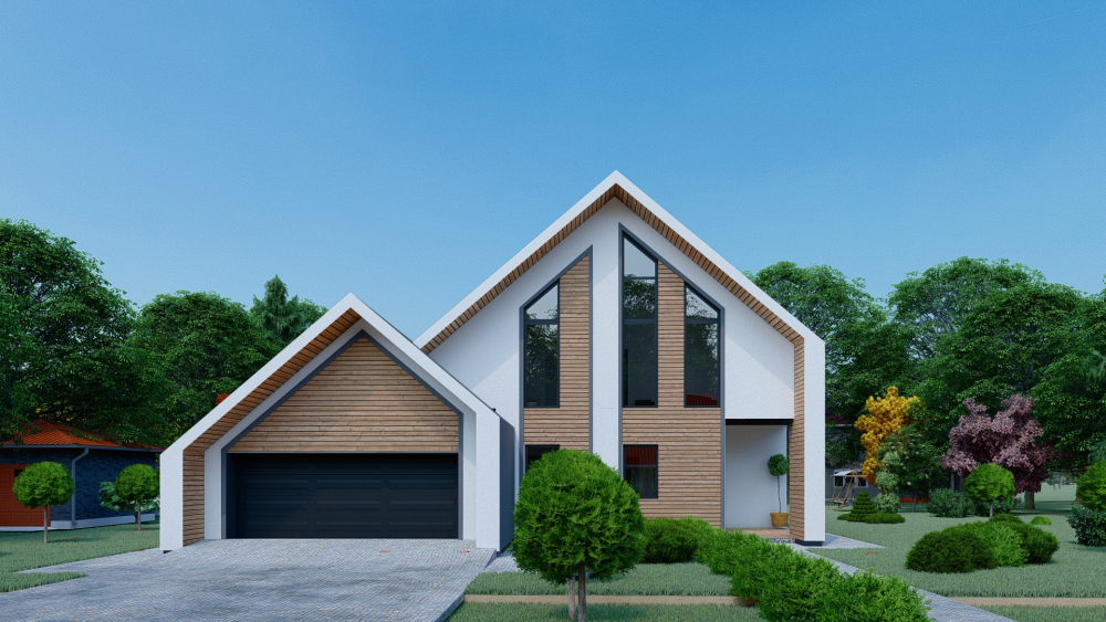 Двоповерховий будинок зі світлої мінеральної штукатурки, що поєднана з вертикальною дерев’яною рейкою в площинах фронтонів і між вікнами; темна покрівля підкреслює графіку силуету. На головному фасаді — асиметричні панорамні вікна у фронтоні та виразний портал входу. З правого боку – навіс-галерея, що переходить у простору задню терасу під глибоким виносом покрівлі; опора-стійка формує чисту вісь композиції. Зліва — інтегрований гараж на 2 авто з окремим двосхилим фронтоном. На бічному фасаді передбачені дахові вікна для природного освітлення внутрішнього простору. З тильного боку — велика скляна стіна з двосвіттям у вітальні та виходом на терасу для літньої зони відпочинку.