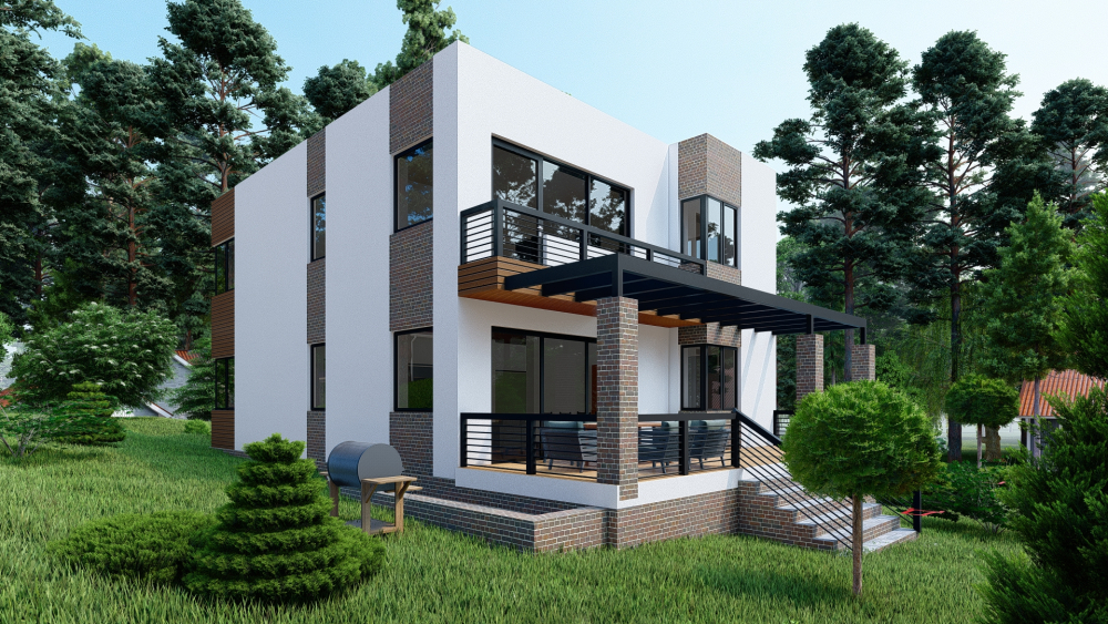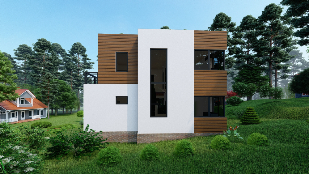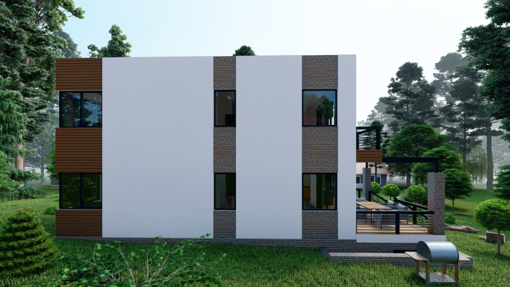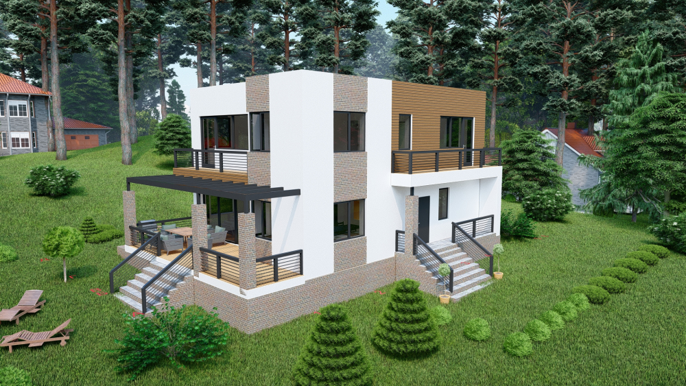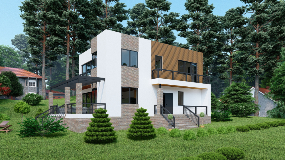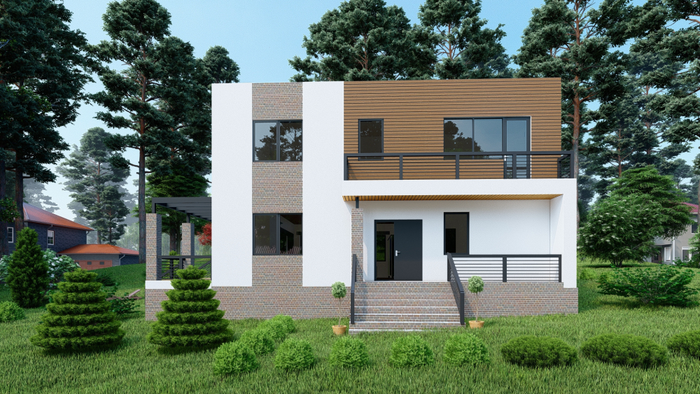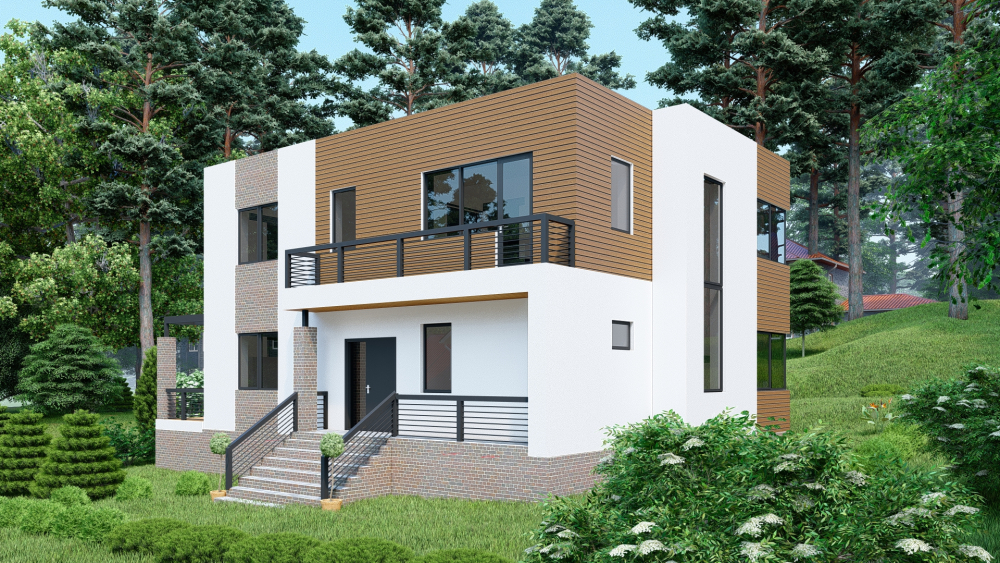 Сучасний двоповерховий котедж з плоским дахом, що вирізняється комбінованим оздобленням фасадів. Основу становить світла штукатурка, доповнена вертикальними вставками з цегляної кладки та горизонтальними панелями теплого відтінку. Будинок має великі вікна з темними рамами, котрі забезпечують гарне освітлення. Передбачені кілька балконів і терас з металевими поручнями, що створюють додаткові зони відпочинку на свіжому повітрі. Одна з терас обладнана перголою для затінку. До вхідних груп ведуть сходи з цегли та світлих плит.