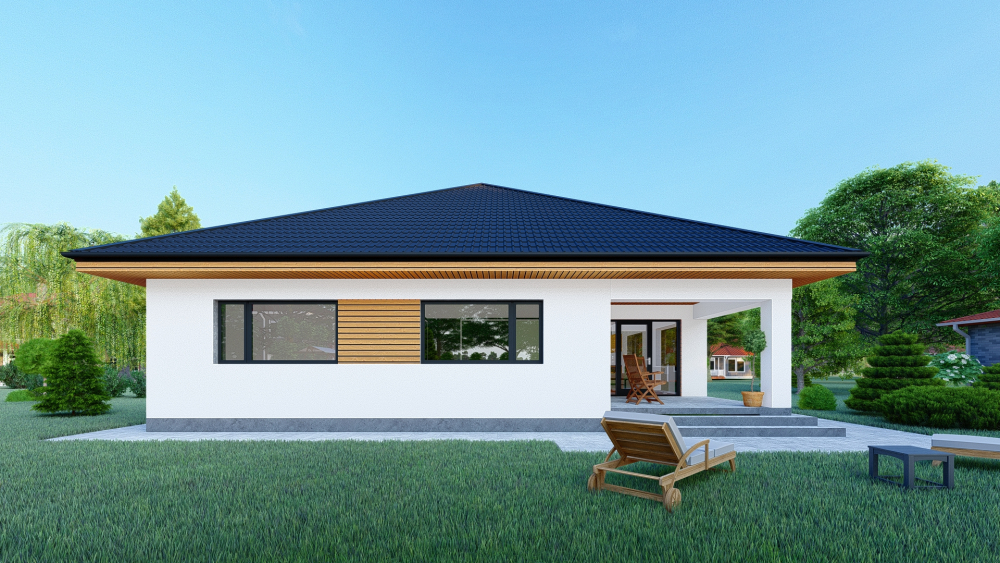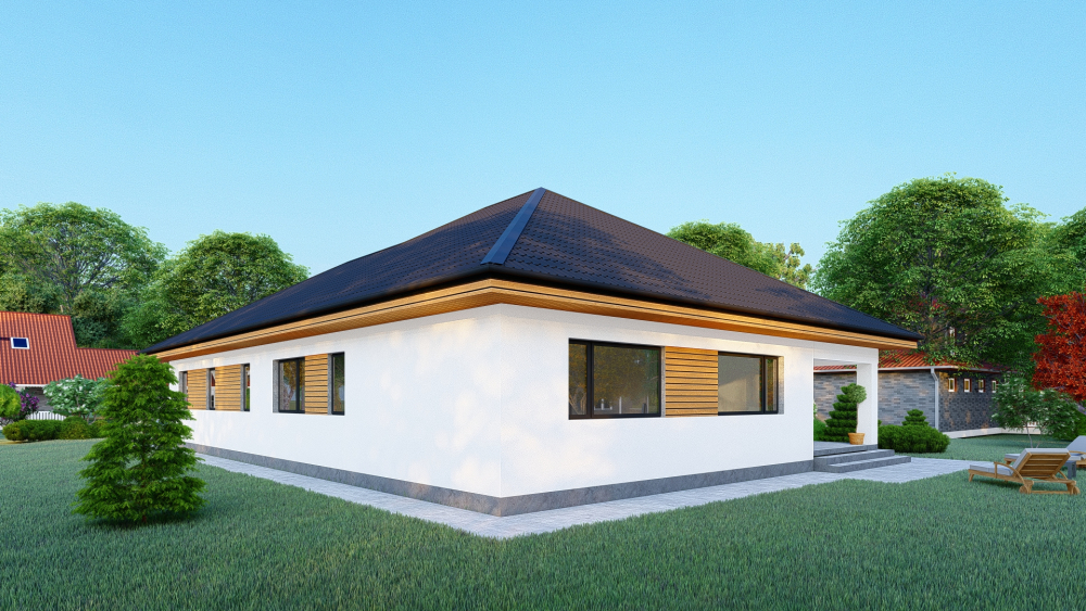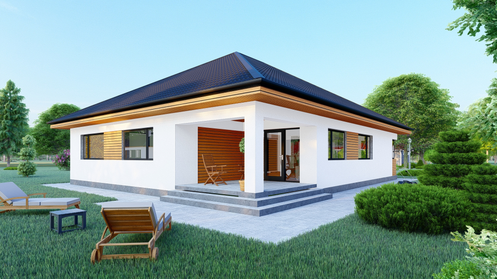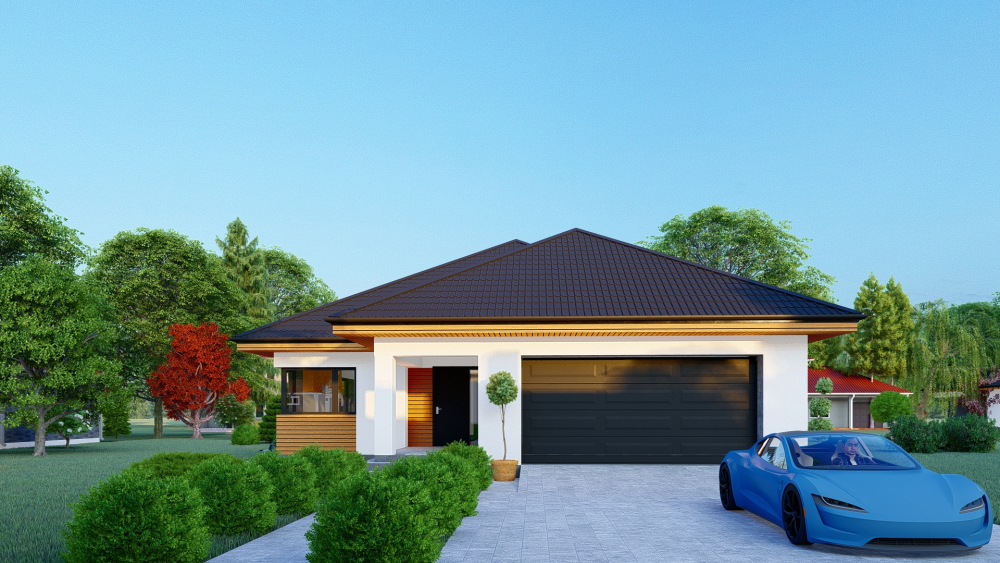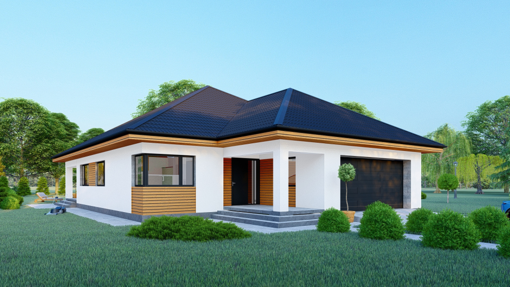 Сучасний одноповерховий будинок з чіткою геометрією об’ємів. Фасади оздоблені у світлих тонах з акцентами під натуральне дерево. Великі панорамні вікна відкривають простір для природного освітлення. Архітектура передбачає гараж на 2 авто, що інтегрований в загальний об’єм будинку, а також простору терасу з виходом у двір. Ззовні будинок виглядає стримано і функціонально, орієнтований на комфортне життя однієї родини.