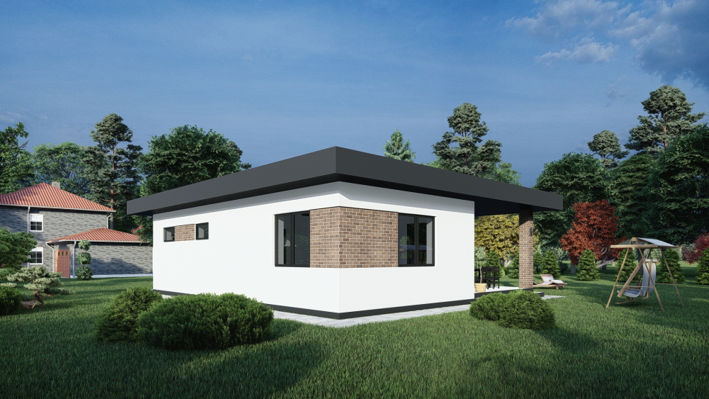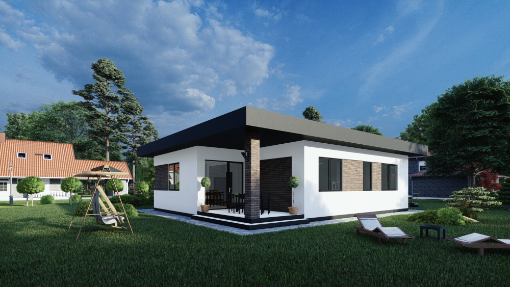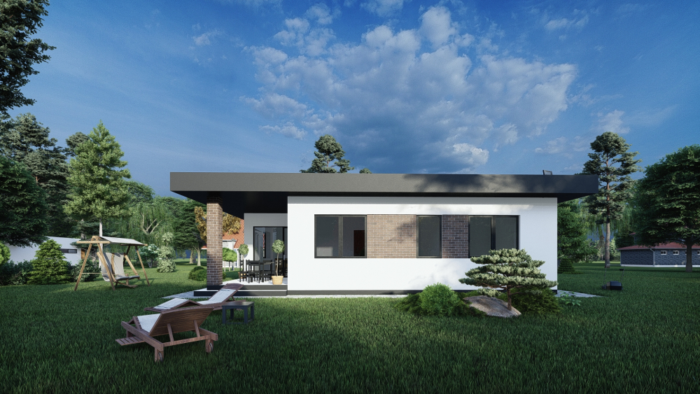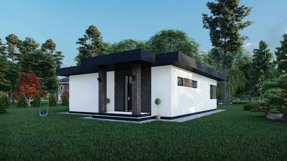 Одноповерховий будинок в сучасному стилі, що поєднує в собі чистоту ліній та контрастні матеріали. Фасади оздоблені світлою штукатуркою, що ефектно поєднується з декоративними вставками з темної цегли та широким темним фризом плаского даху. Акцентом проєкту є простора крита тераса біля головного входу та великі вікна, що забезпечують чудове природне освітлення внутрішнього простору.