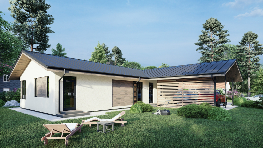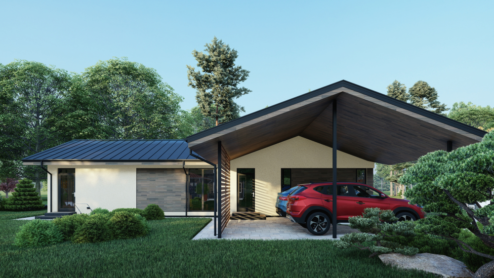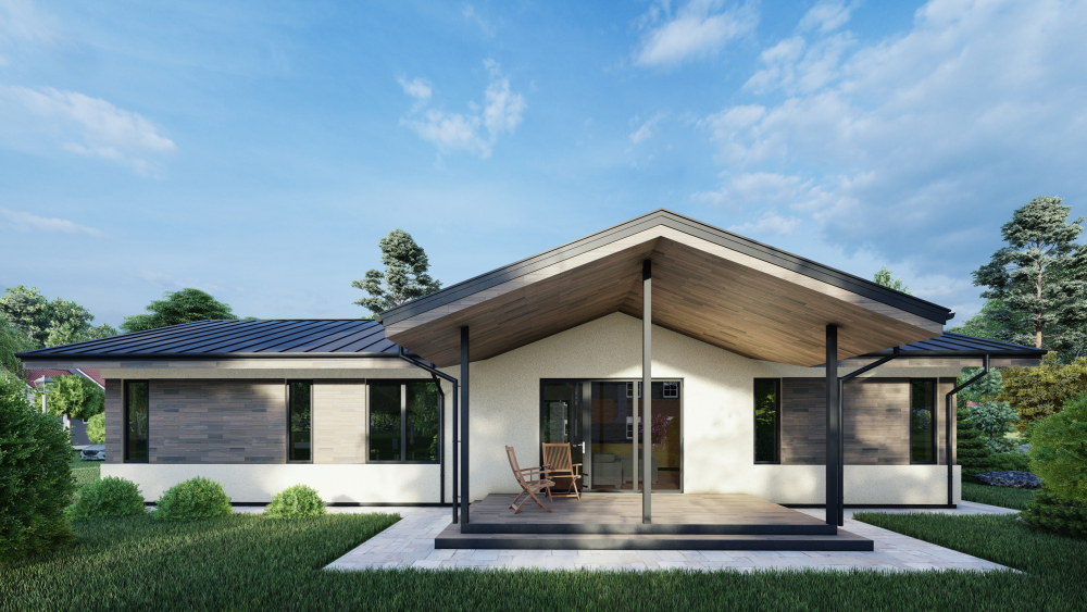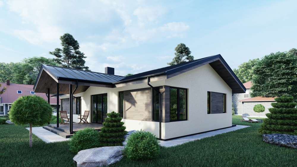 Сучасний одноповерховий котедж з великим чотирьохсхилим дахом з темного металопрофілю. Фасади поєднують світлу штукатурку та вставки з деревного декору, що надають будівлі тепла та природності. Простора тераса під дахом та відкрите паркомісце на два авто під навісом створюють зручну зону для відпочинку та побуту. Великі панорамні вікна забезпечують інтер'єр природним світлом, а продумане планування підходить для комфортного життя родини.