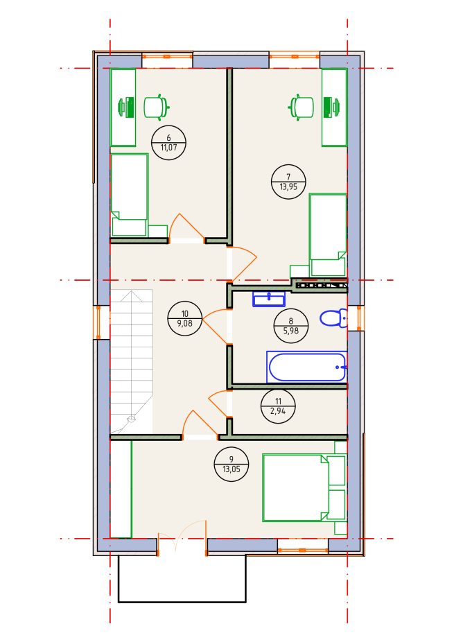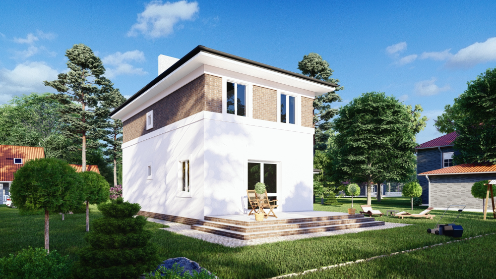 Компактний двоповерховий будинок у класичному стилі з чотирисхилим дахом та виразними звісами. Проект відрізняється раціональним плануванням: на першому поверсі розташована відкрита зона кухні-вітальні та окремий кабінет, який може слугувати гостьовою кімнатою. Другий поверх вміщує три повноцінні спальні та ванну кімнату. Фасад прикрашений балконом та декоративними вставками з клінкерної плитки. Поруч із будинком передбачено навіс для автомобіля.