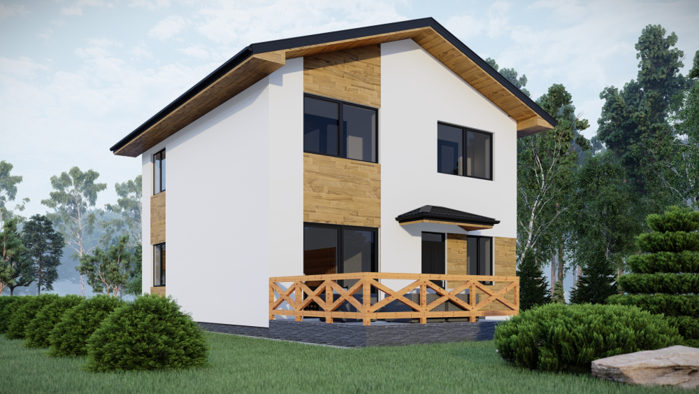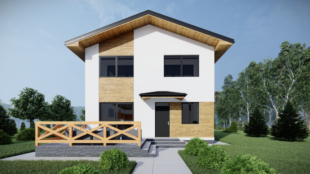 Двоповерховий будинок у класичному стилі з двосхилим дахом та лаконічним дизайном. Фасад поєднує білу штукатурку з декоративними вставками під дерево, що надає будівлі сучасного та затишного вигляду. Це надзвичайно функціональний проект категорії компактних будинків, який при невеликій площі забудови вміщує шість повноцінних спалень (дві на першому поверсі та чотири на другому), два санвузли та простору зону кухні-вітальні з виходом на терасу. На другому поверсі розташований великий балкон.