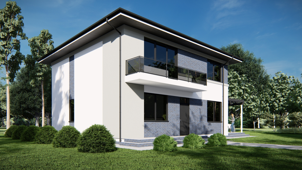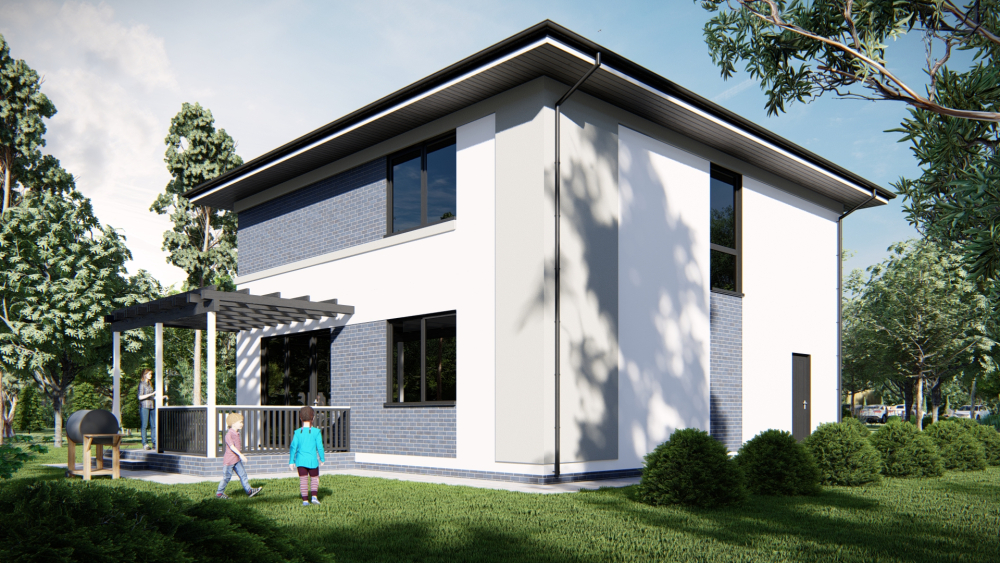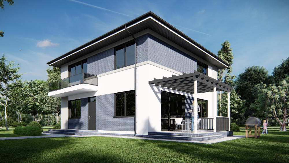 Сучасний двоповерховий будинок у класичному стилі з чотирисхилим дахом. Фасад вирізняється стильним контрастом білої штукатурки та синьо-сірої декоративної цегли, якою оздоблено перший поверх та міжвіконні простори. Будинок доповнений балконом та затишною терасою з перголою.