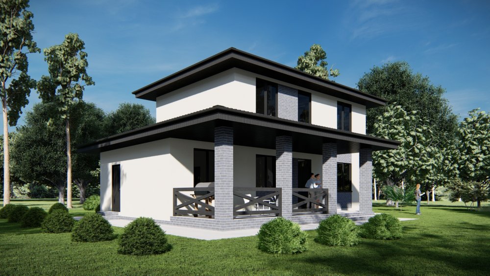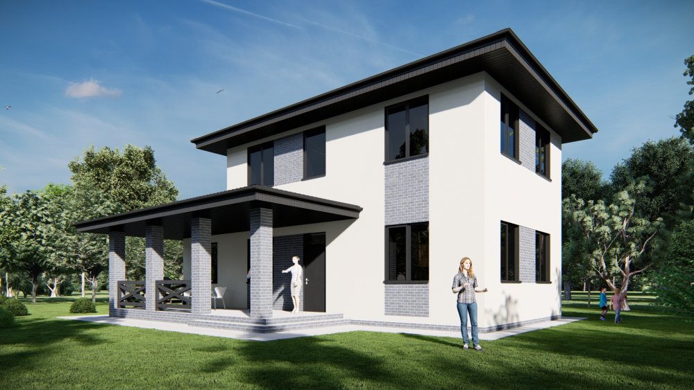 Сучасний двоповерховий будинок у класичному стилі з чотирисхилим дахом. Фасад має виразний дизайн завдяки контрастному оздобленню: перший поверх виконаний з використанням темної клінкерної цегли, а другий — зі світлої штукатурки з дерев'яними акцентами під дахом.