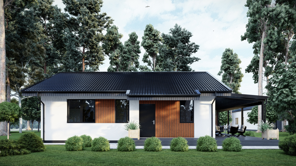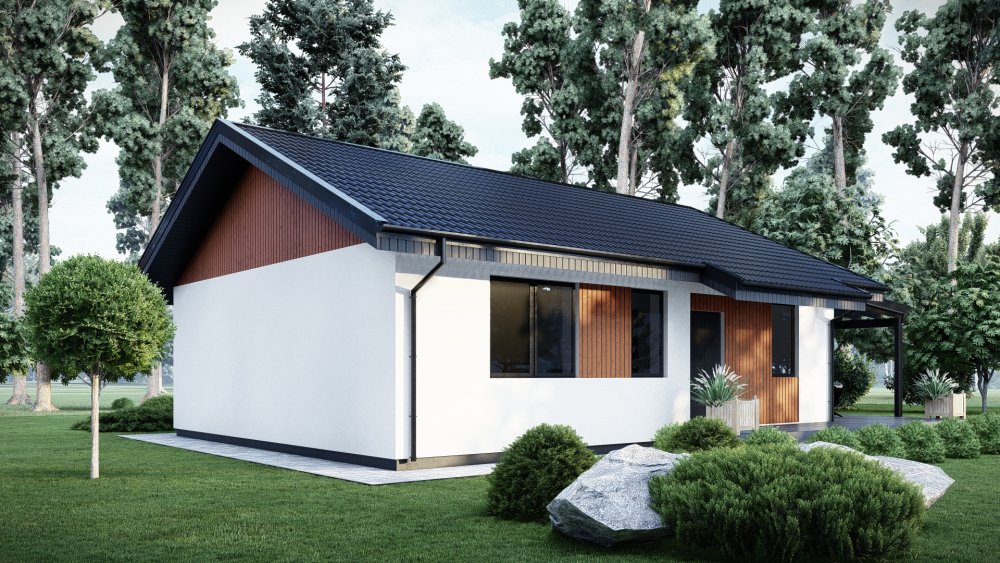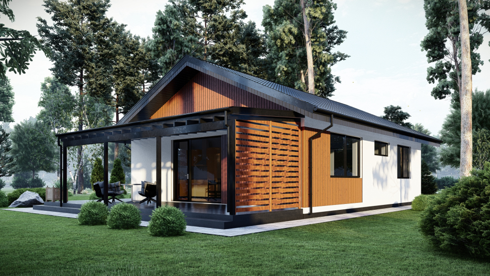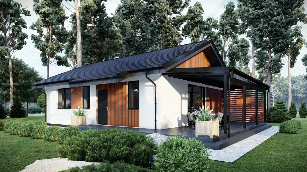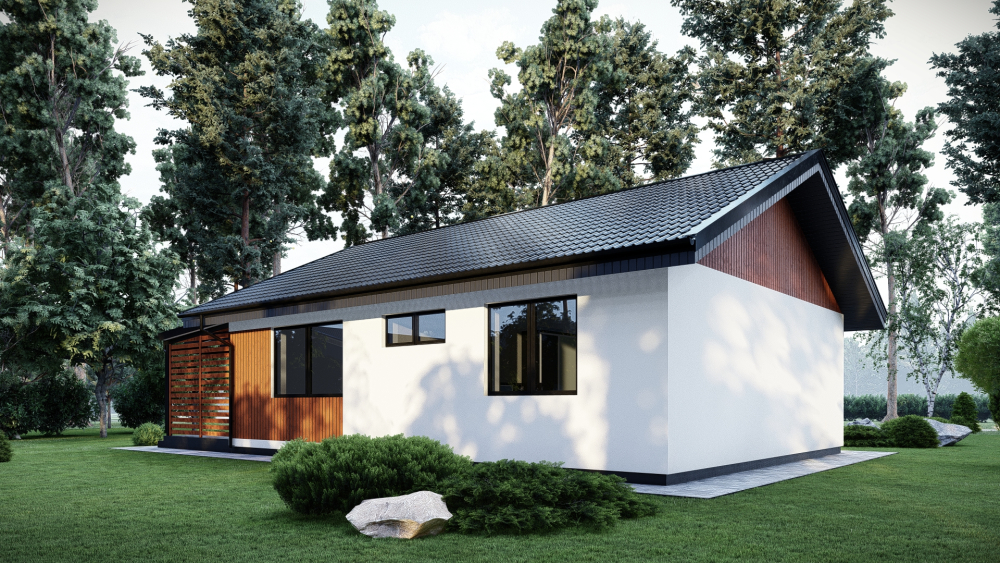 Компактний одноповерховий будинок з двосхилим дахом та просторою терасою з перголою. Фасад оздоблений білою штукатуркою з дерев'яними акцентами на фронтонах та навколо вікон, що надає будівлі сучасного та екологічного вигляду. Будинок ідеально підходить як для постійного проживання невеликої родини, так і в якості гостьового котеджу.